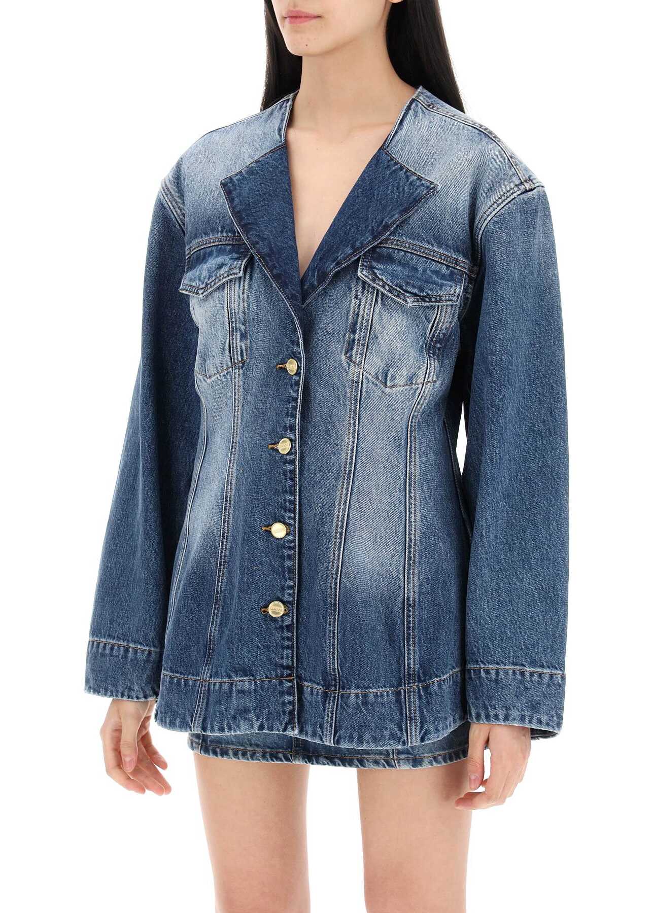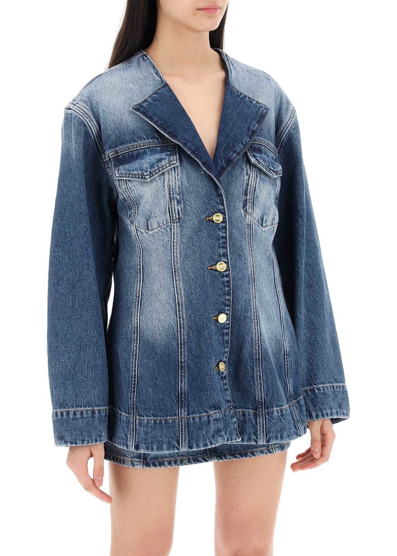 This Ganni denim blazer is made of organic cotton and features a V-neckline, button closure, and flap pockets on the chest. The back is adorned with a butterfly logo in rhinestones and it has a regular fit. The model is 177 cm tall and wears a size 36.