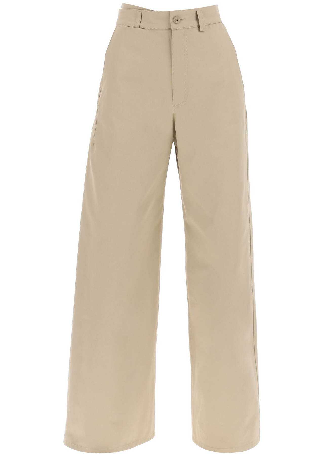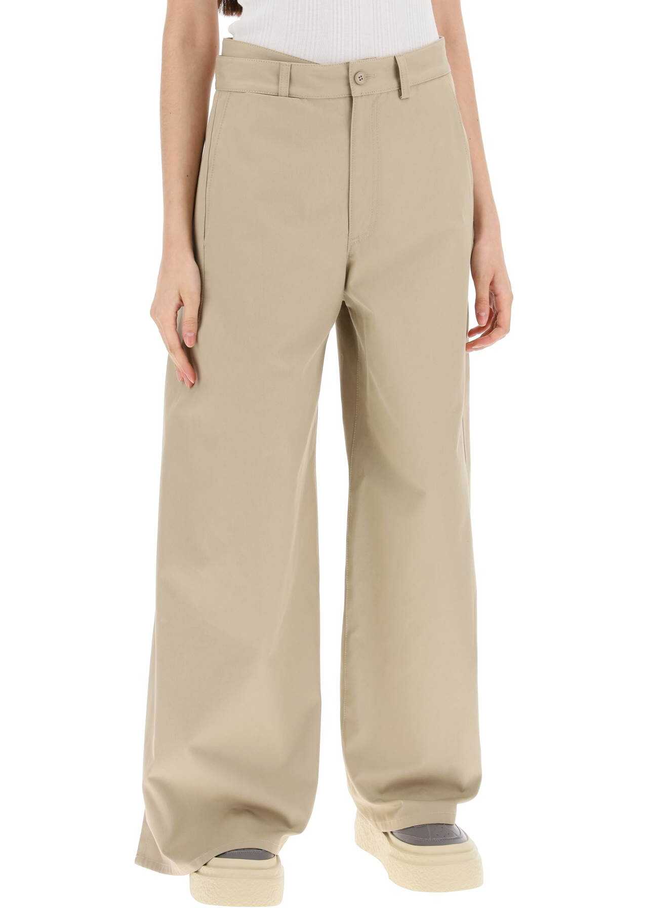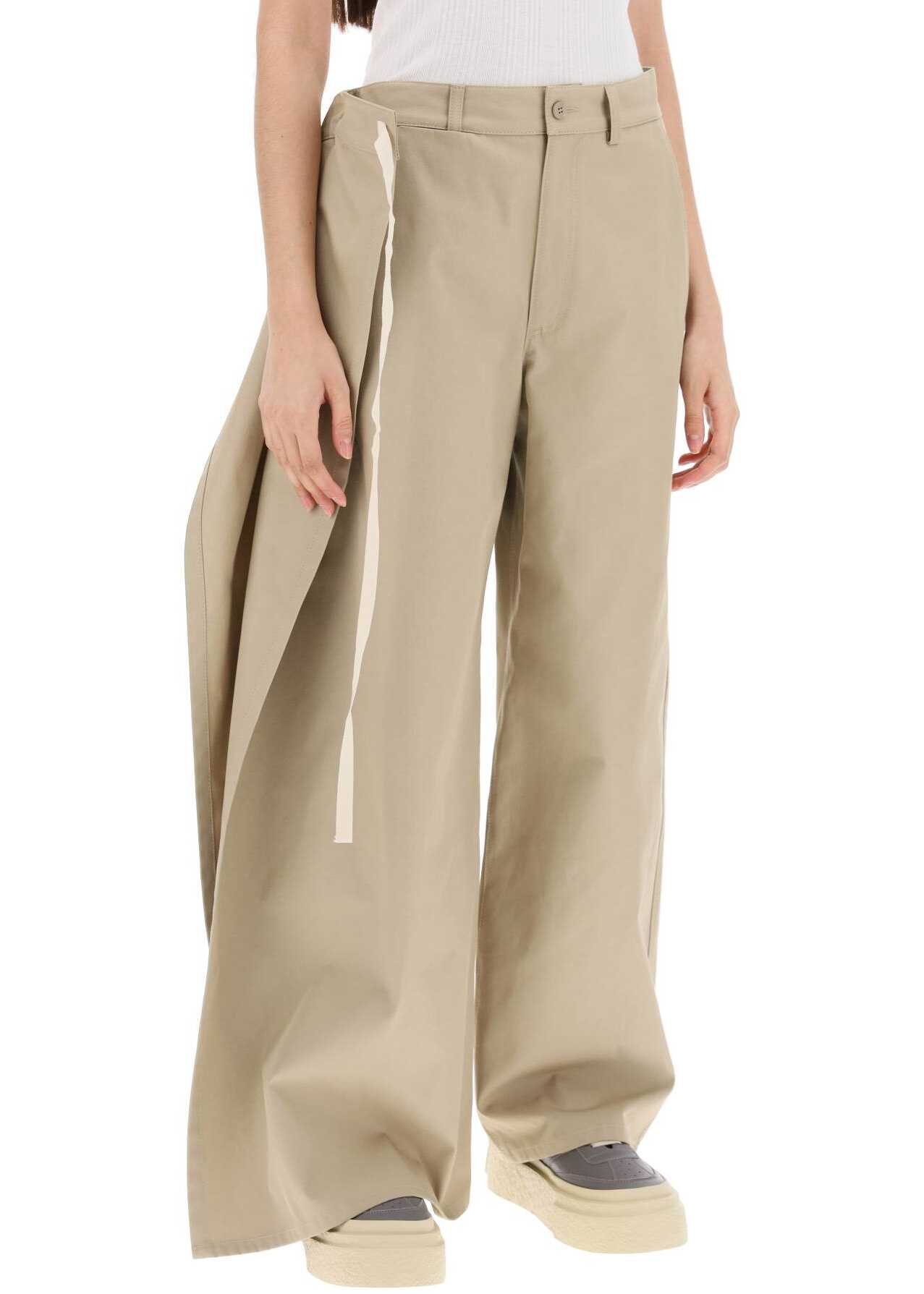 These MM6 Maison Margiela pants are made of cotton gabardine and feature a side panel that can be tied at the back or fixed on the side for a versatile look. They have a hidden zip and button closure, French pockets, and welt pockets on the back, with a wide leg design. The model is 177 cm tall and wears a size 40 IT.