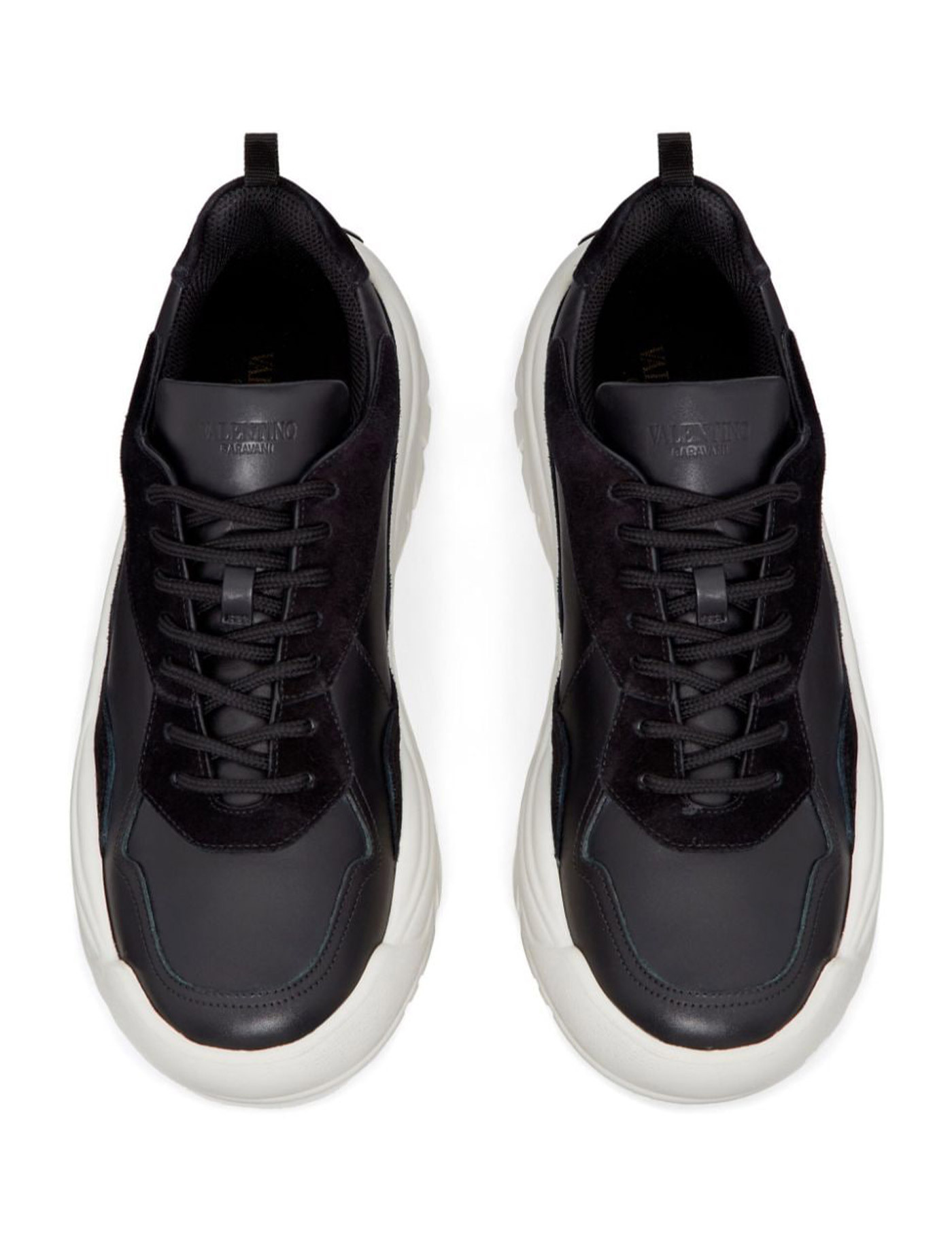 Calfskin Gumboy Sneakers by Valentino Garavani, lace-up front fastening, round toe, textured sole, panelled design, suede leather detailing, iconic brand monogram press-stamped on side panel.