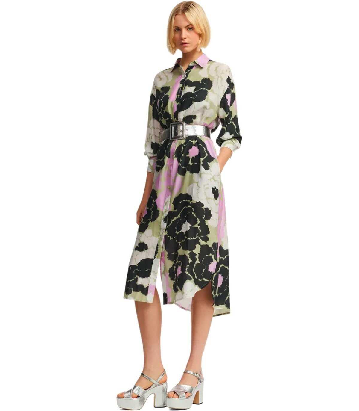 Freya shirt dress by Essentiel Antwerp made of silk with an abstract pattern in shades of lilac, black, pistachio, and cream. Matching sash at the waist, button closure. Asymmetrical cut, slightly longer at the back. Oversize fit.
