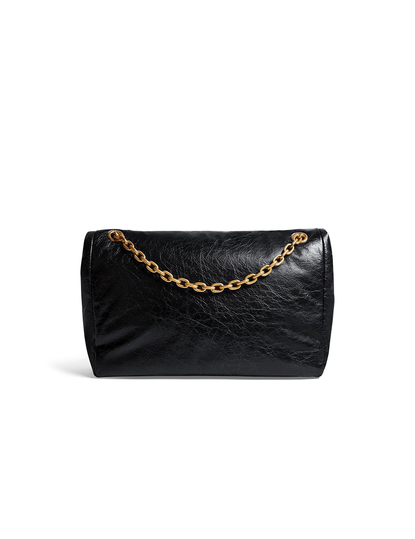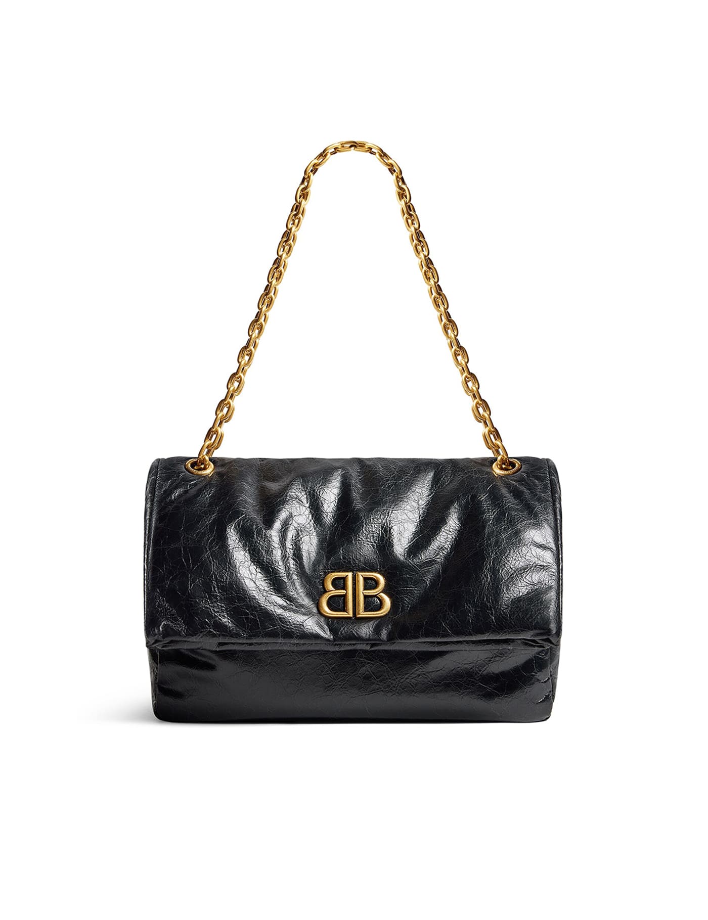 Calfskin Medium Monaco Shoulder Bag by Balenciaga, oversized padded design, front closure via fold-over magnetic flap, three-dimensional plaque with iconic brand logo applied in contrast at front, sliding chain shoulder strap, single internal compartment.