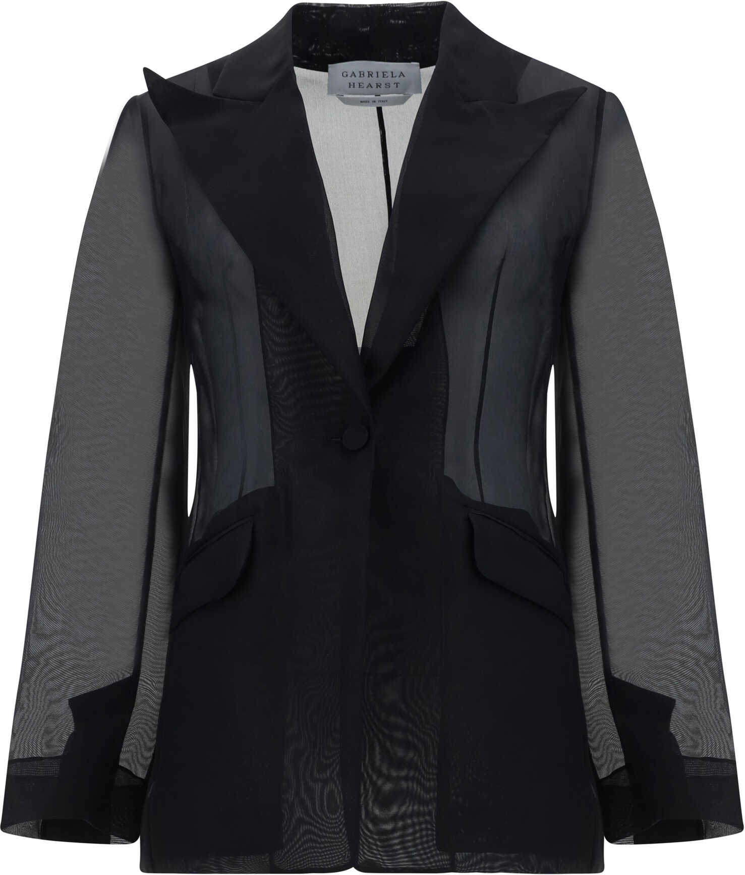 Silk Leiva Blazer Jacket by Gabriela Hearst, featuring wide spear lapels, front button closure, two welt flap pockets on front, back slit, semi-transparent design, monochrome pattern, regular fit.