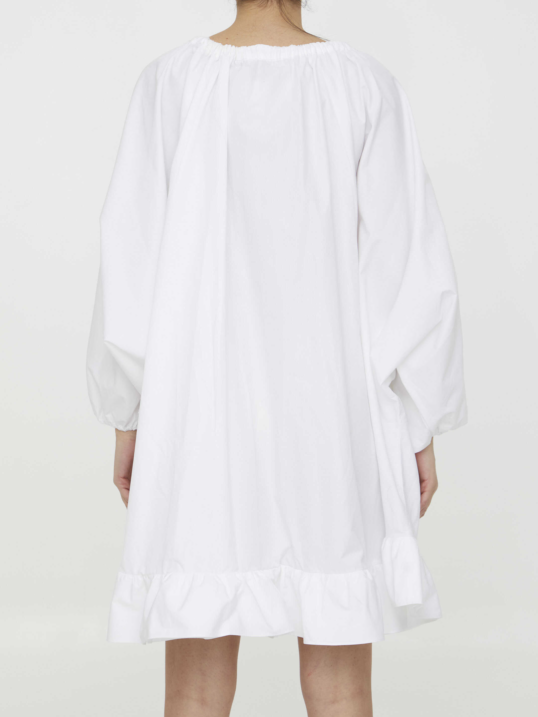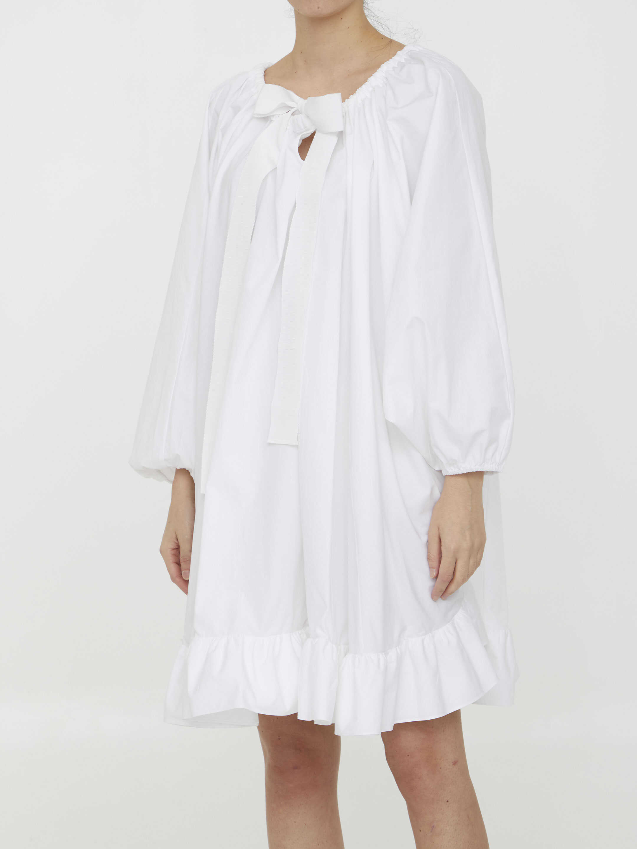 White recycled faille dress with ruffled hem. Stretch neckline with grosgrain drawstring and balloon sleeves with stretch cuffs.