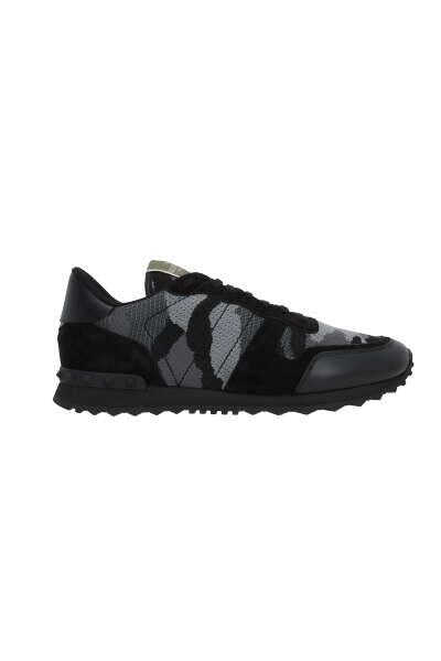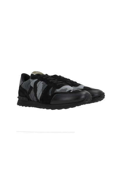 Valentino Garavani's low-top sneakers crafted in black smooth leather / suede and camouflage-motif knit inserts. Featuring lace-up closure, a round-toe silhouette, logo label on tongue, fabric lining and textured rubber sole. The design is completed by rubber studs around the heel. The sneakers come with an additional set of shoelaces.
