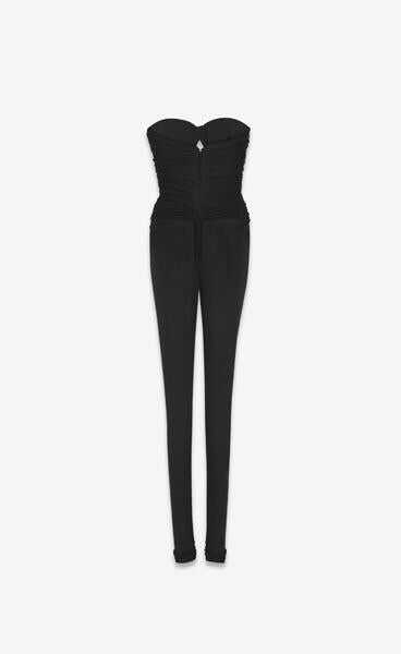Saint Laurent's bustier jumpsuit crafted in black crepe. Featuring sweatheart neckline, back hook-and-eye / invisible zip closure, front crossed drapes / cut-outs and side vents with covered buttons. Partially lined interior.
