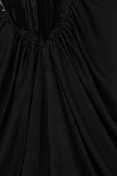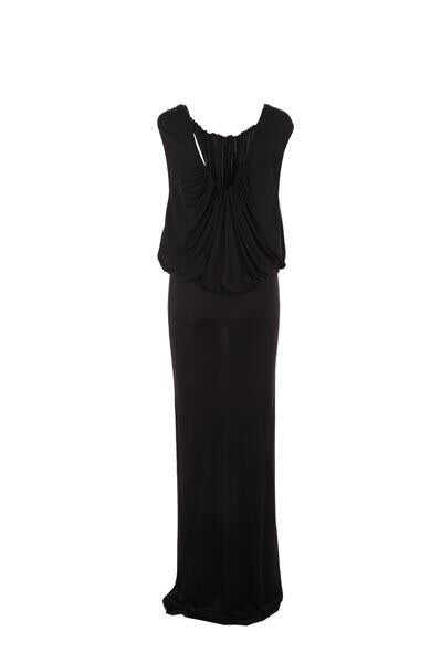 Saint Laurent's sleeveless long dress crafted in black shiny responsible jersey. Featuring band straps, front U-neckline and back wide V-neckline with curled edge. The design is completed by the pleated details. Unlined interior.