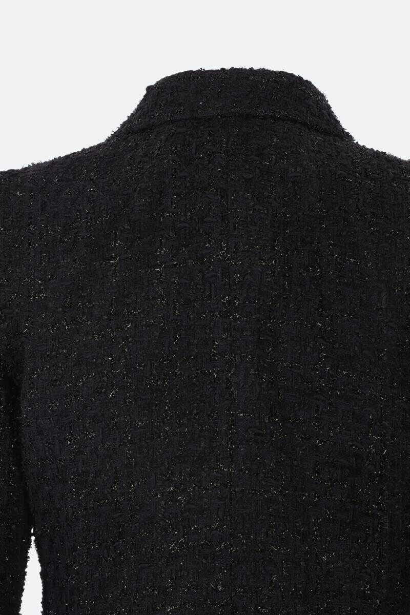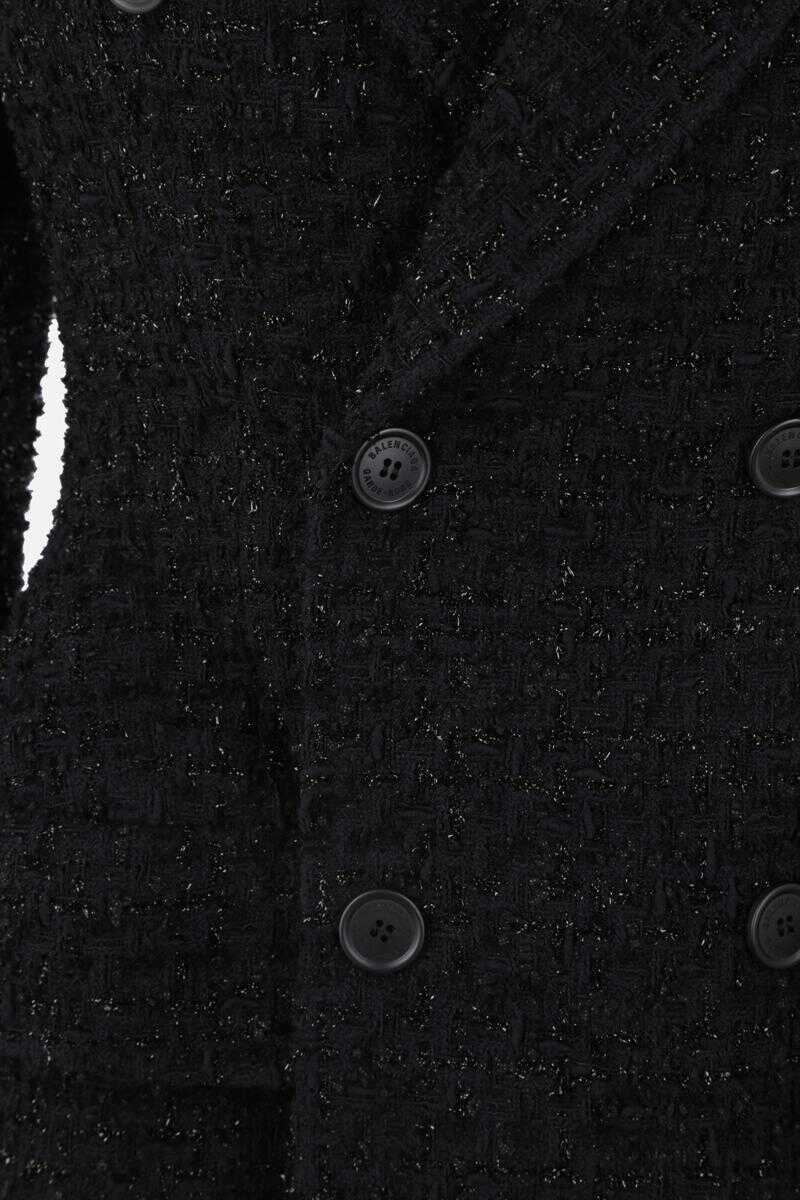 Balenciaga's double-breasted jacket crafted in black tweed. Featuring peak lapel, button closure, padded shoulders, long sleeves with buttoned cuffs, front pockets and straight hem. Lined interior.