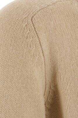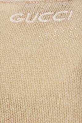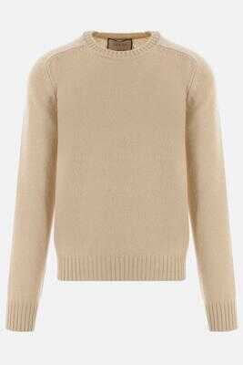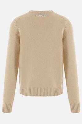 Gucci's pullover crafted in beige wool with lettering logo embroidery at back. Featuring crew neck, long sleeves and ribbed edges.