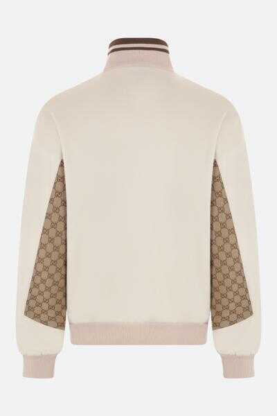 Gucci's jacket crafted in ivory technical jersey with GG jacquard in the shades of brown with logo patch at chest. Featuring high neck, half-zip closure, long sleeves, kangaroo pocket and ribbed edges. Lined interior.