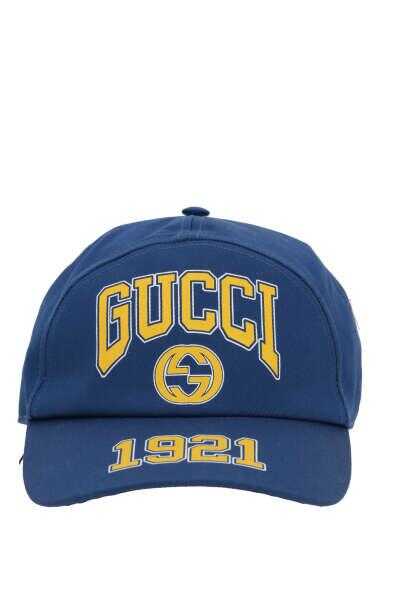 Gucci's baseball cap crafted in bright blue cotton gabardine with contrasting Gucci Interlocking G 1921 print. It features adjustable velcro backstrap and unlined interior.