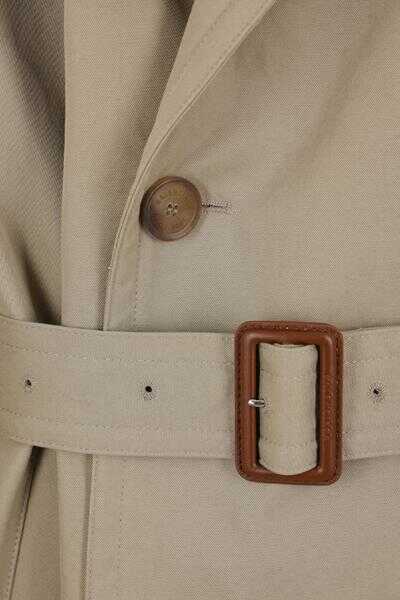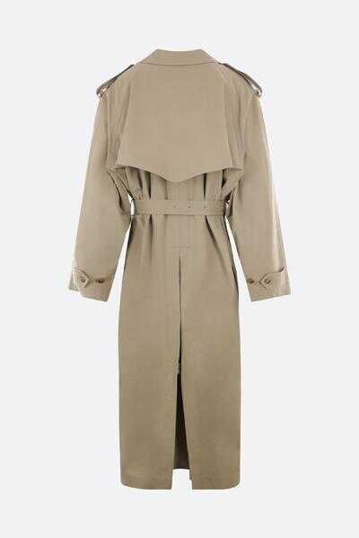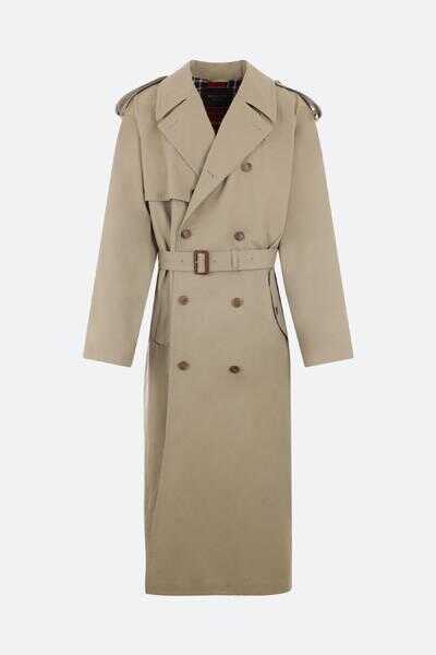Balenciaga's double-breasted oversized trench coat crafted in beige cotton drill with removable belt. Featuring wide lapel, tabs at shoulders, long sleeves wtih tabs at cuffs, button closure, multiple pockets, back stormshield and box-pleat at hem at back. Lined interior.