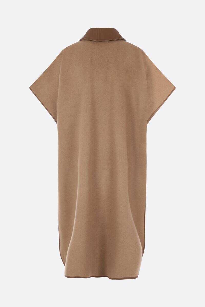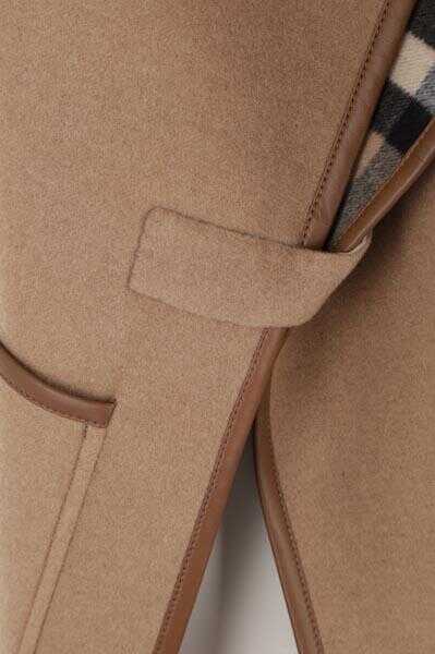 Burberry's reversible cape crafted in beige wool on one side and checked motif wool on the other side in the shades of beige / red / white / black. Featuring pointed collar, snap-button closure, open sides with buttoned belt, front pockets and contrasting trims.