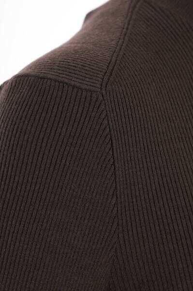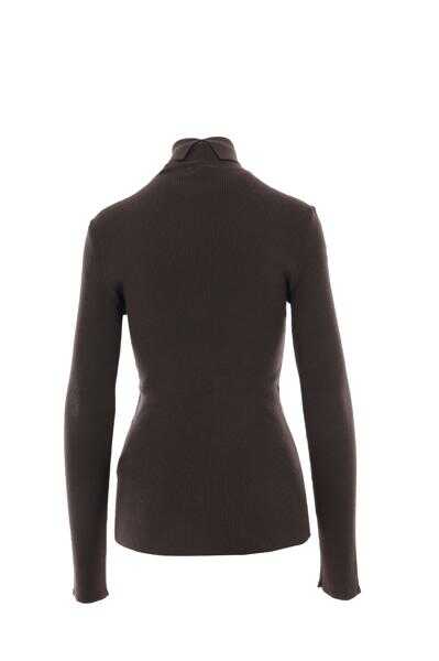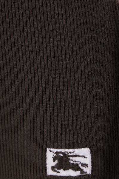 Burberry's pullover crafted in brown ribbed wool blend knit with Equestrian Knight logo intarsia at hem. Featuring high neck with turn-down, long sleeves and straight hem.