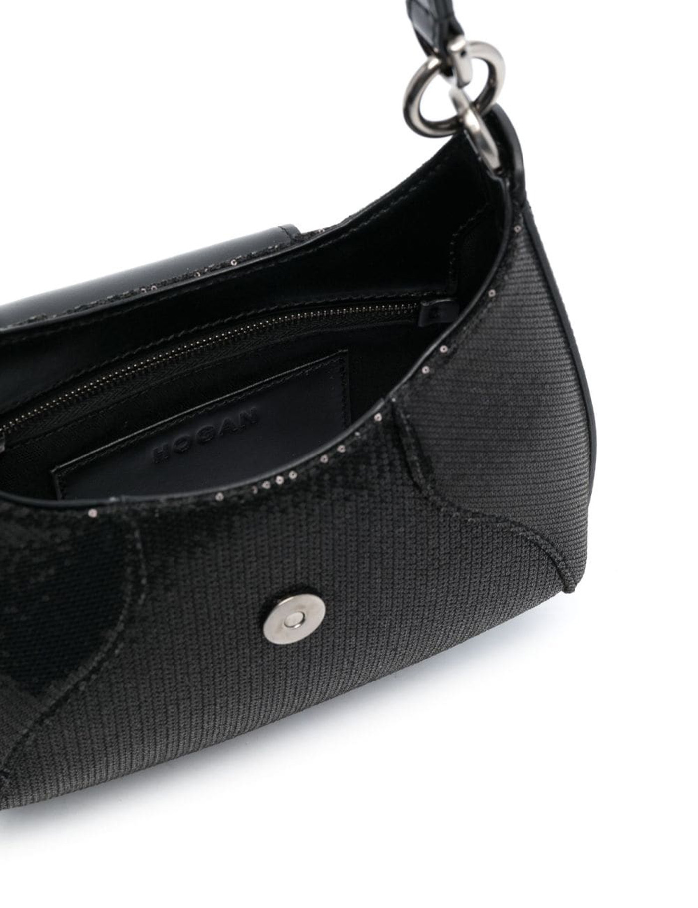 Hobo H shoulder bag from HOGAN featuring black, calf leather, sequin embellishment, tonal design, internal logo patch, silver-tone hardware, logo plaque, foldover top with press-stud fastening, internal zip-fastening pocket, detachable shoulder strap, single flat top handle and main compartment.
