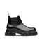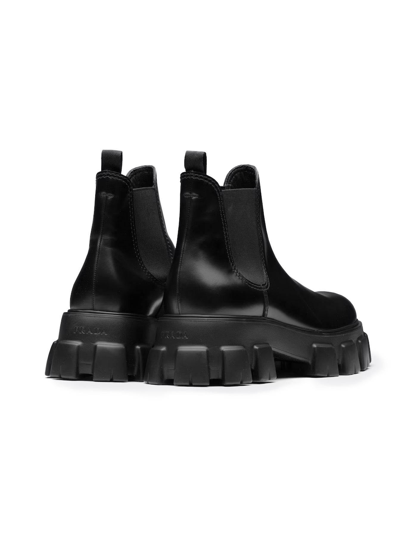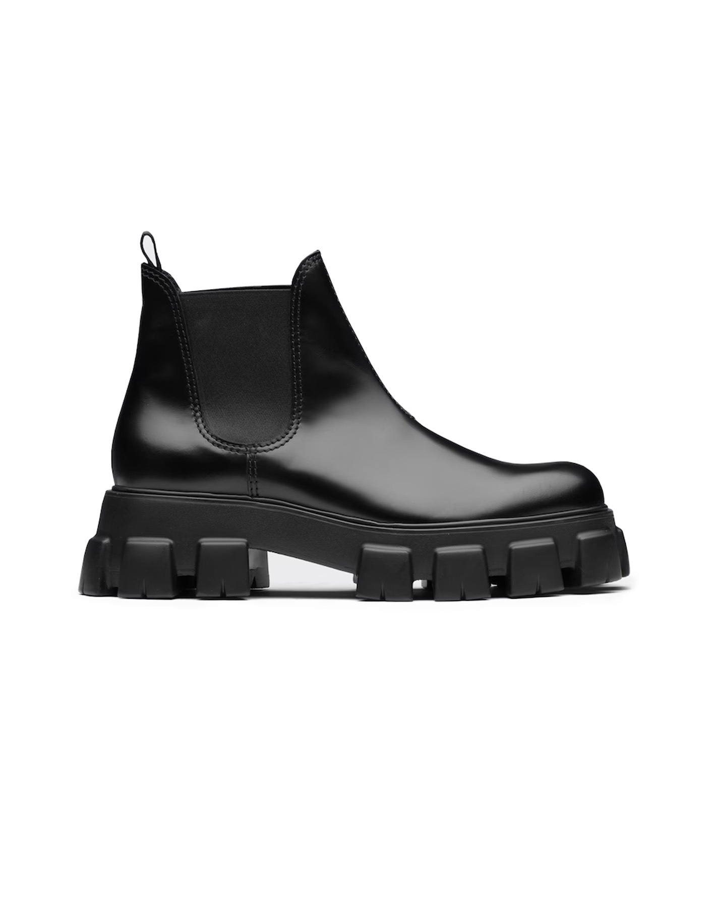 Calfskin Ankle Boots by Prada, round toe, platform sole structured by knurling, stretch fabric inserts on the side panels, leather pull-out on the back to facilitate the fit.