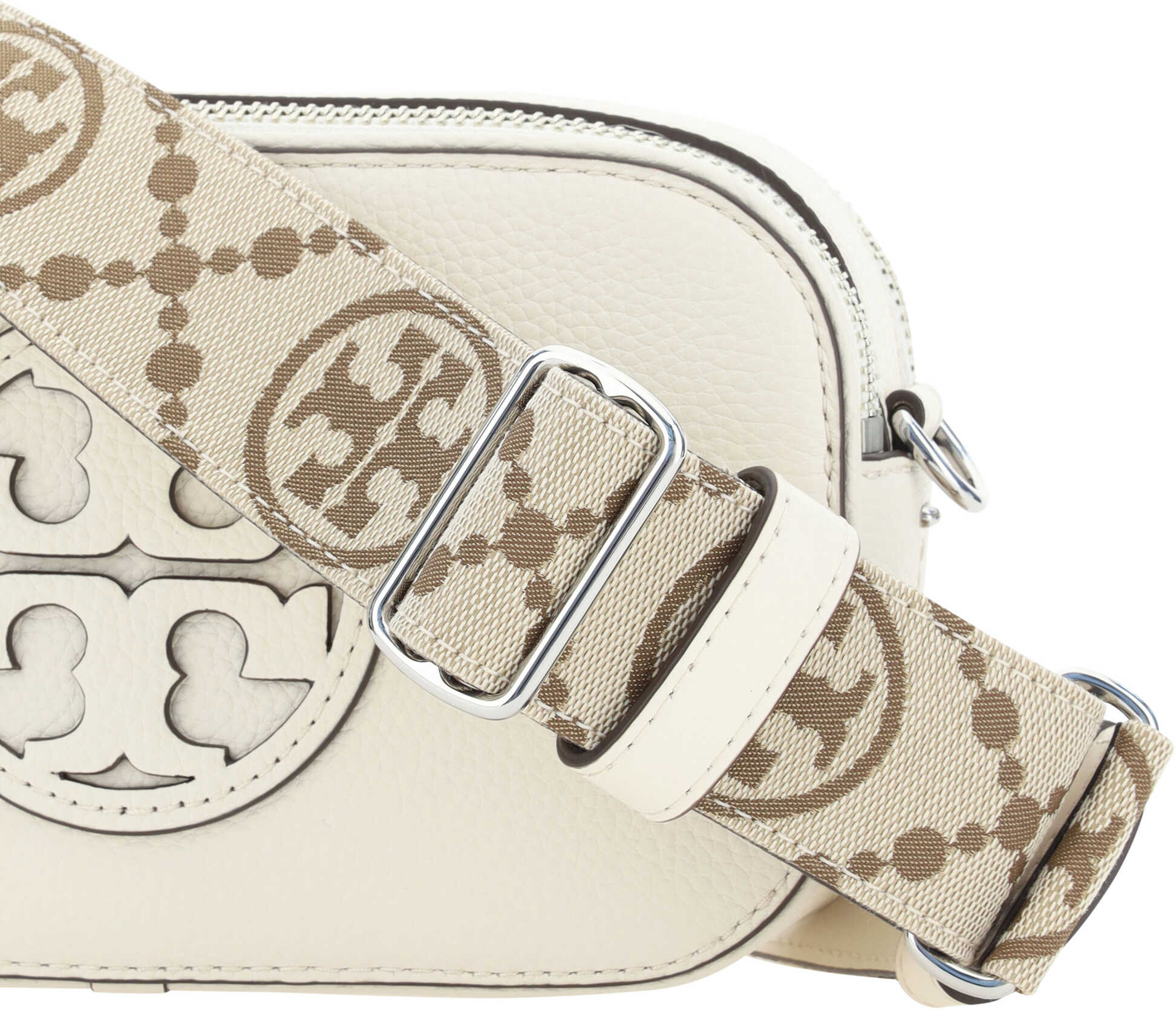 Calfskin Shoulder Bag by Tory Burch, double top zipper closure, iconic brand logo engraved on front, double compartment, tone-on-tone topstitching, jacquard logo webing shoulder strap.