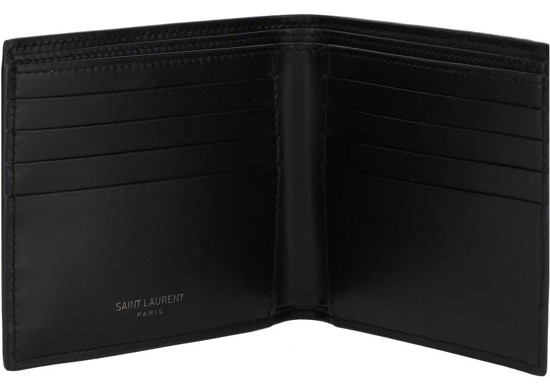 Calfskin Wallet by Saint Laurent, logo plaque on front, bill fold design, internal card slots and bill compartments.