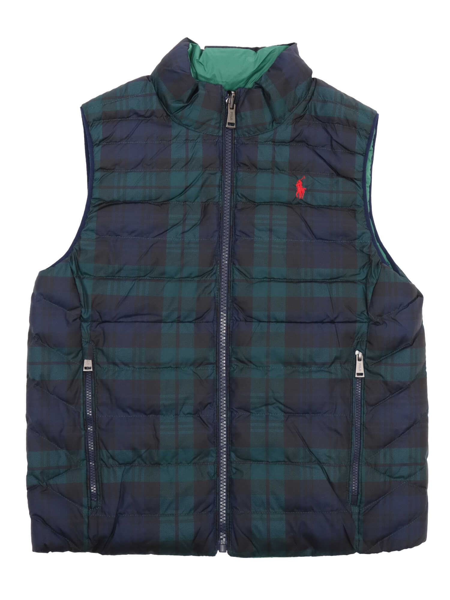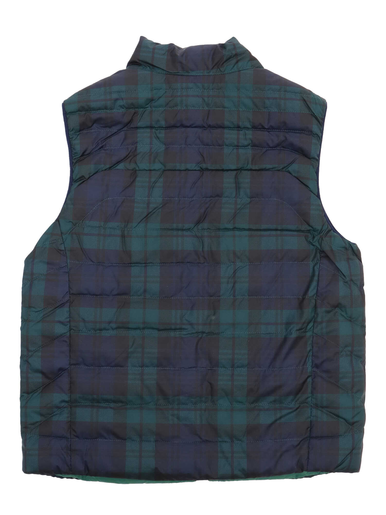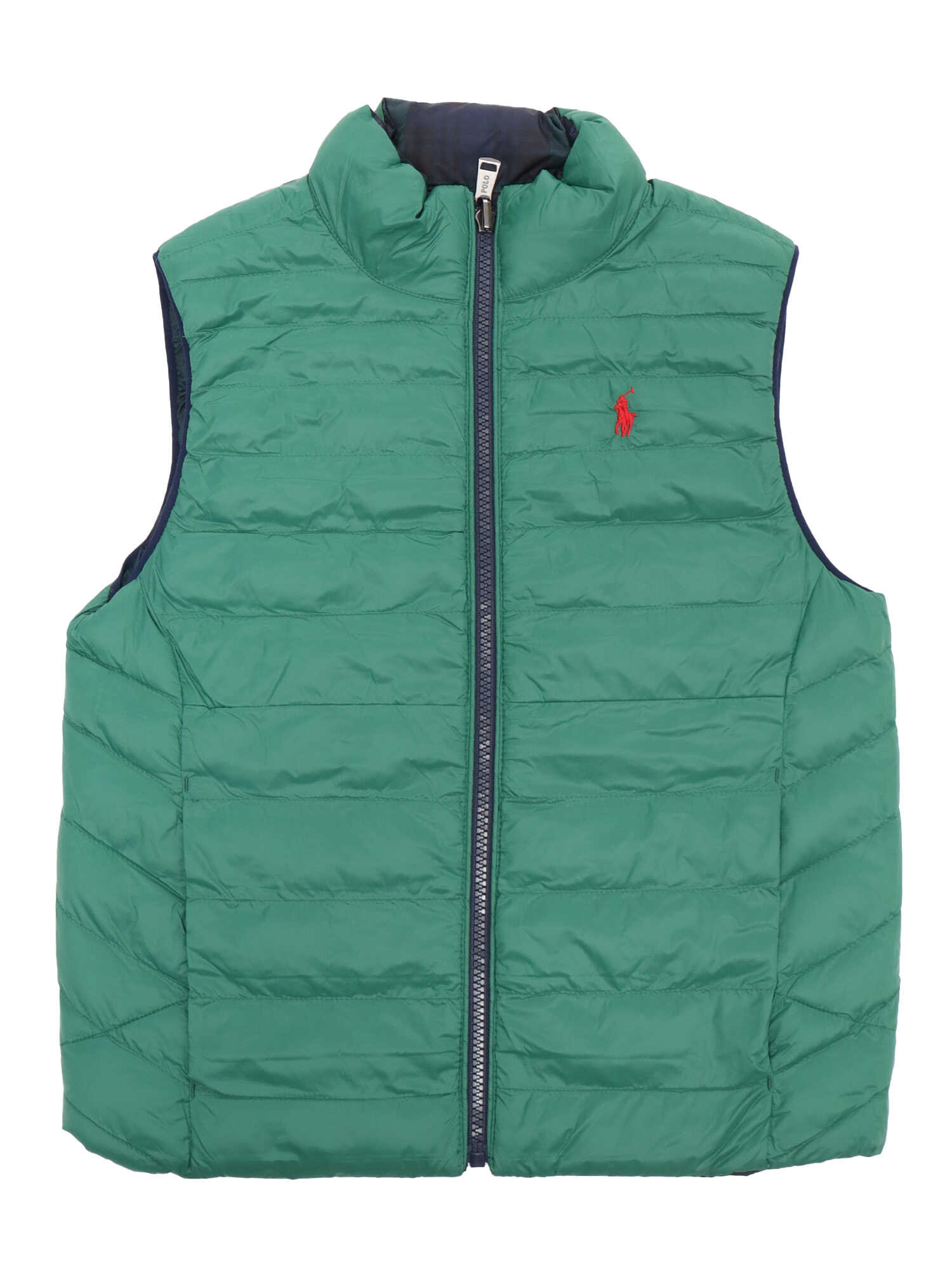 Reversible down jacket in recycled polyester, synthetic padding, side 1 in blue and green check print, side 2 in solid green, zip fastening, multipockets, logo embroidery on the chest