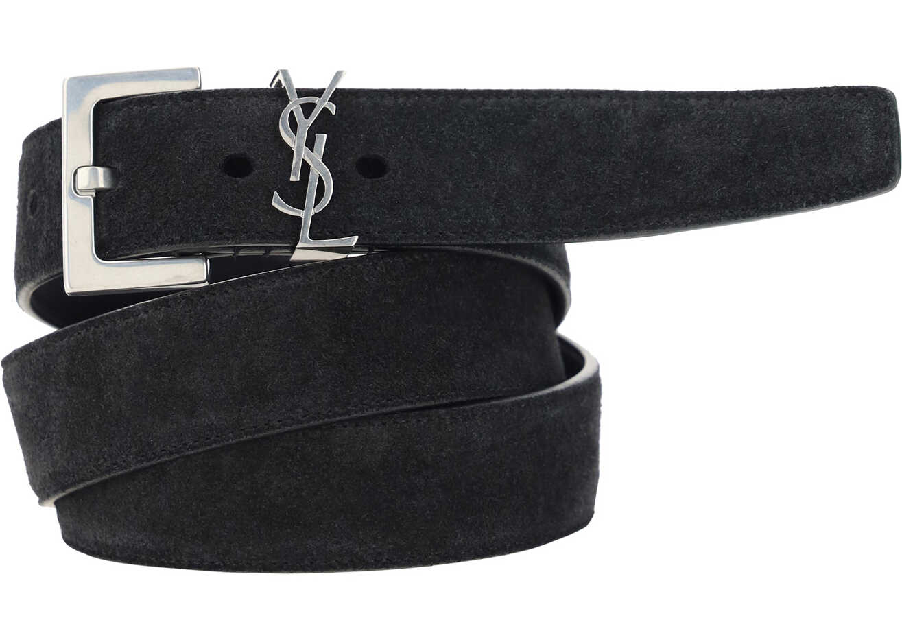 Calfskin Belt by Saint Laurent, smooth leather design, silver-coloured buckle, YSL iconic logo plaque applied to the front.