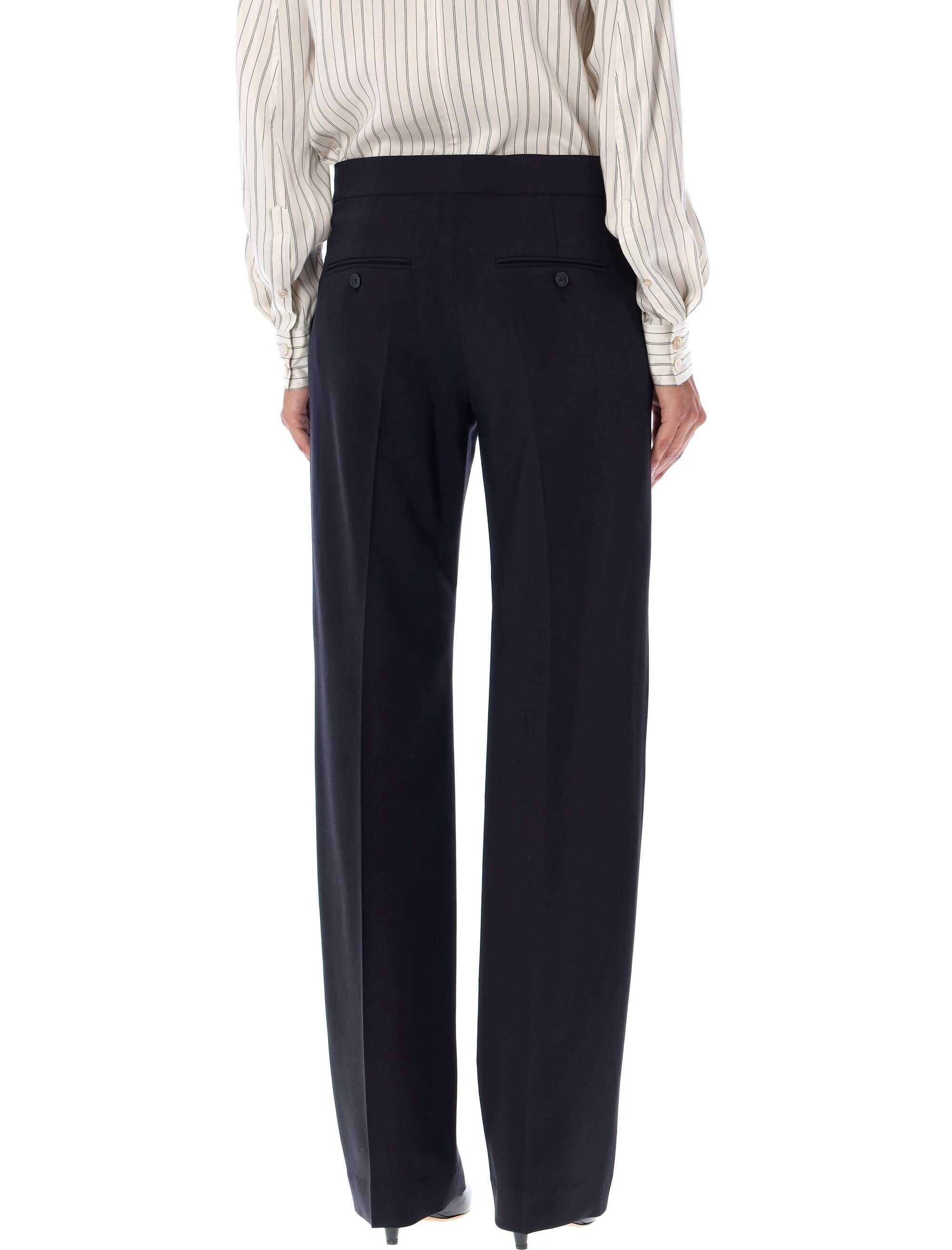 Introducing Mezia formal pants by Isabel Marant. These black trousers are perfect for any occasion. Made with 82% viscose, 15% wool, and 3% elastane, they provide a comfortable fit. The regular waist, zip and hook closure, side pockets, and rear welt buttoned pockets add functionality. The flared design adds a stylish touch. Model is 1.72m and wearing size 36. Upgrade your wardrobe with these elegant pants.
