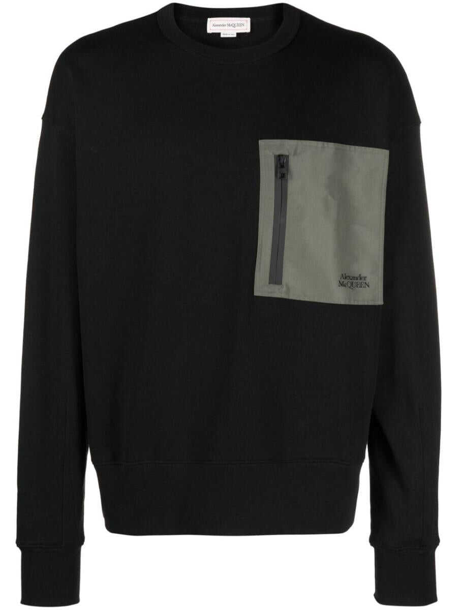 contrasting pocket crew neck sweatshirt from Alexander McQueen featuring black, khaki, cotton, crew neck, zip-fastening chest pocket, embroidered logo at the chest and long sleeves.