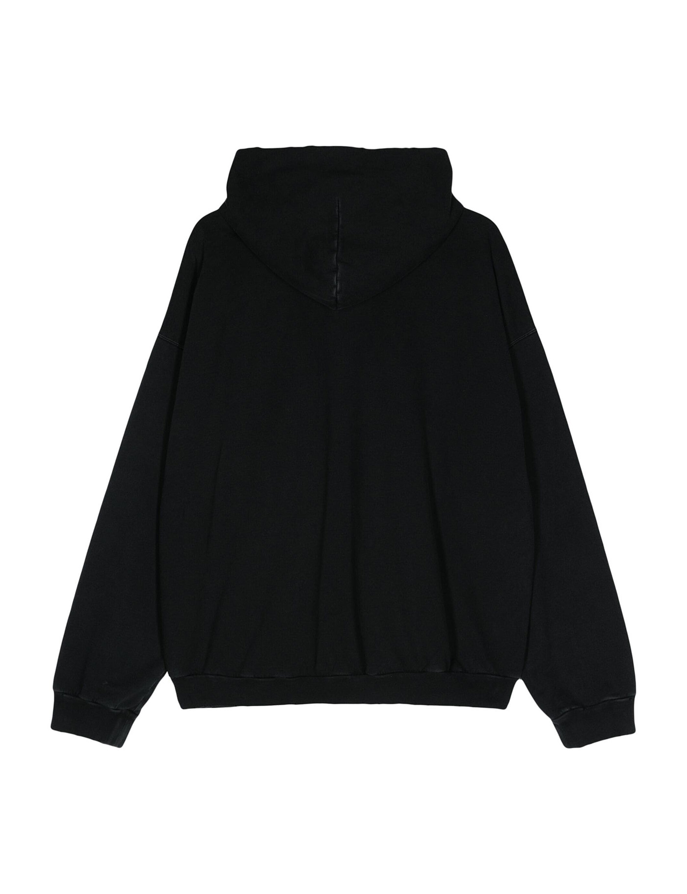 Balenciaga’s medium-fit hoodie in distressed-effect washed black cotton featuring a fixed hood, dropped shoulders, logo print on the front and ribbed edges.