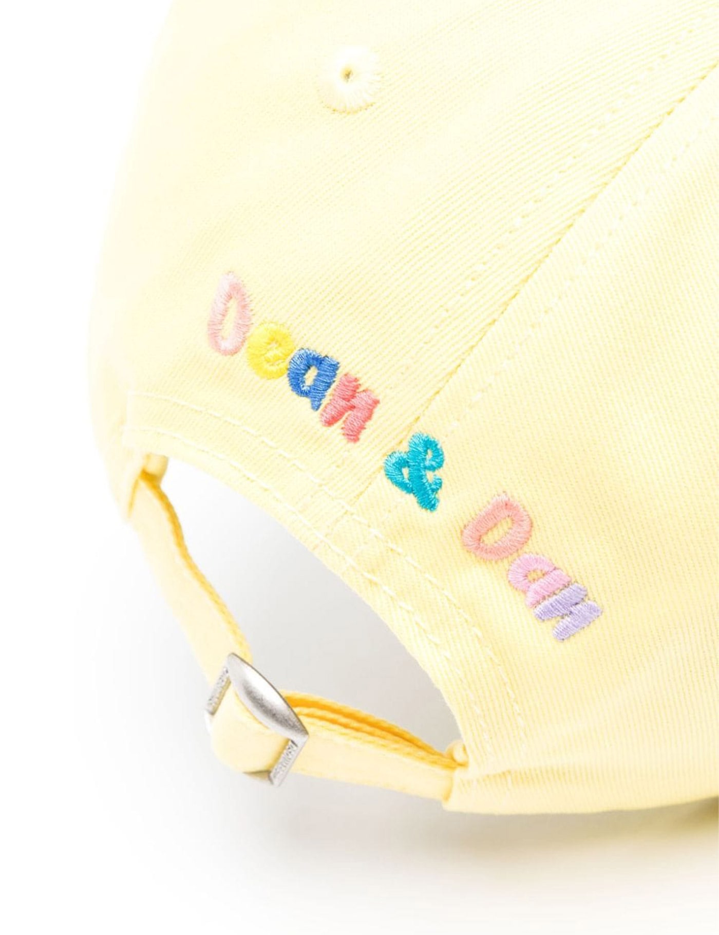 Pastel yellow cotton baseball hat with multicolor patch on the front.