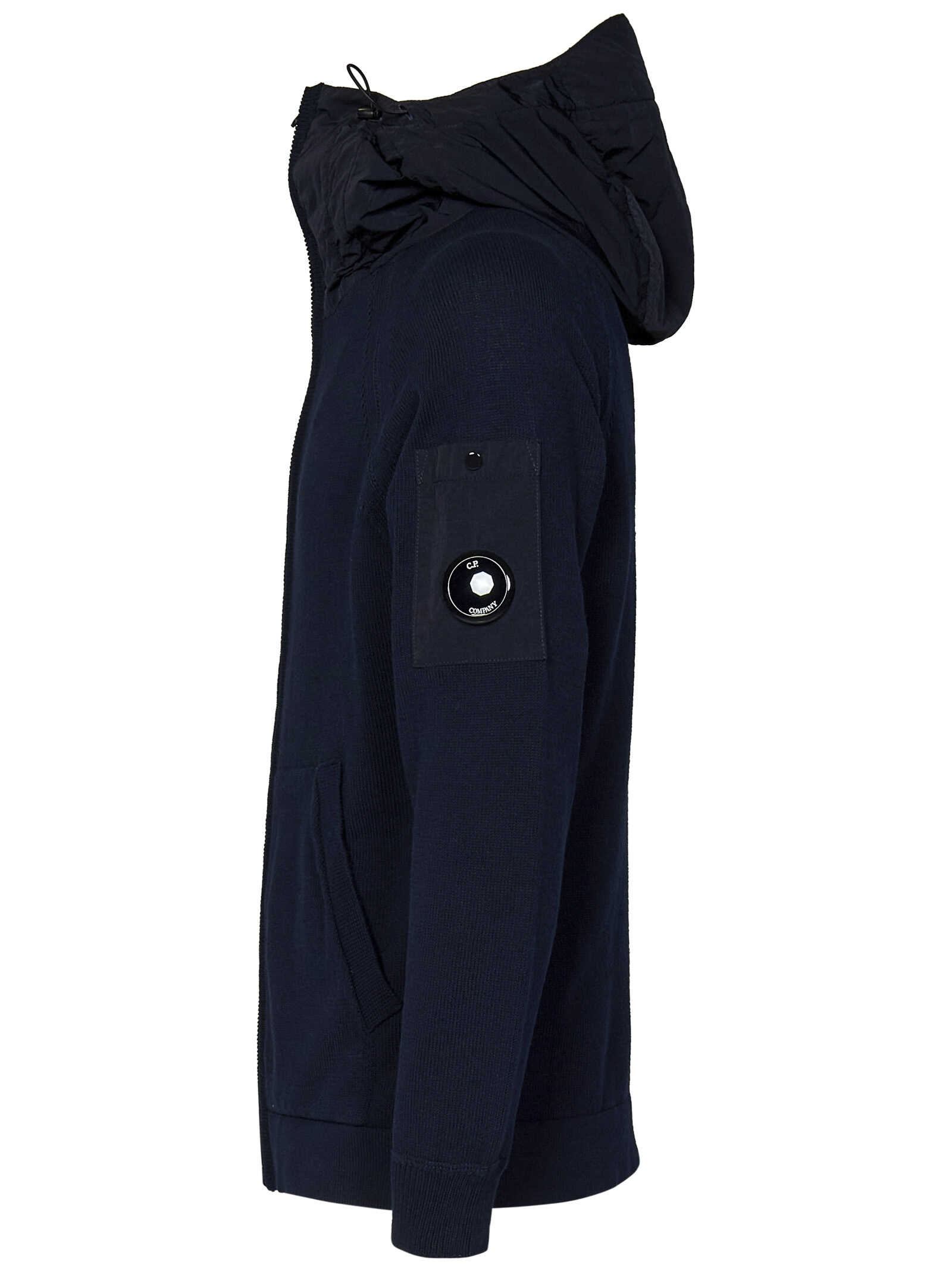 Blue cotton knit zip-up cardigan with Chrome-R hood and Lens detail.