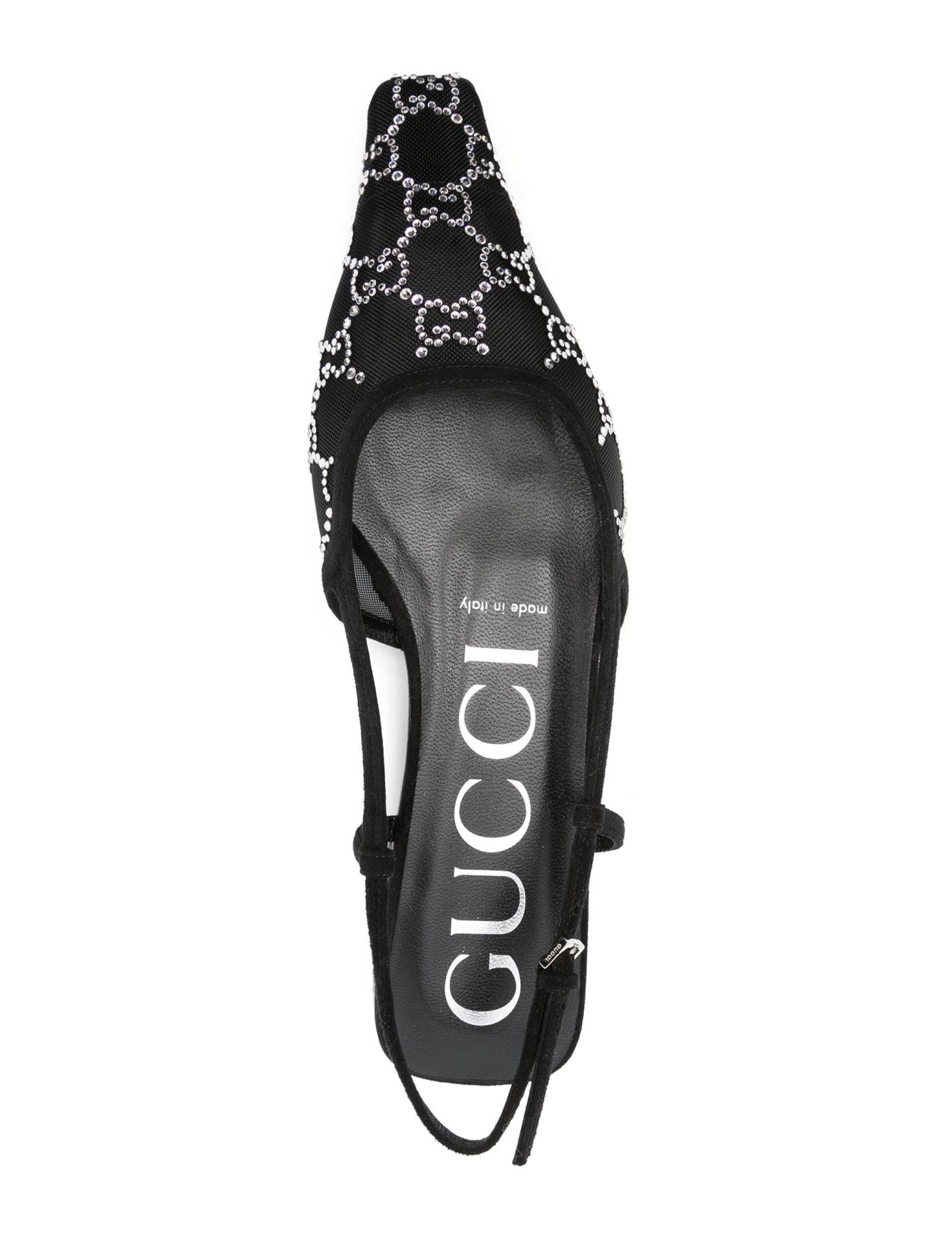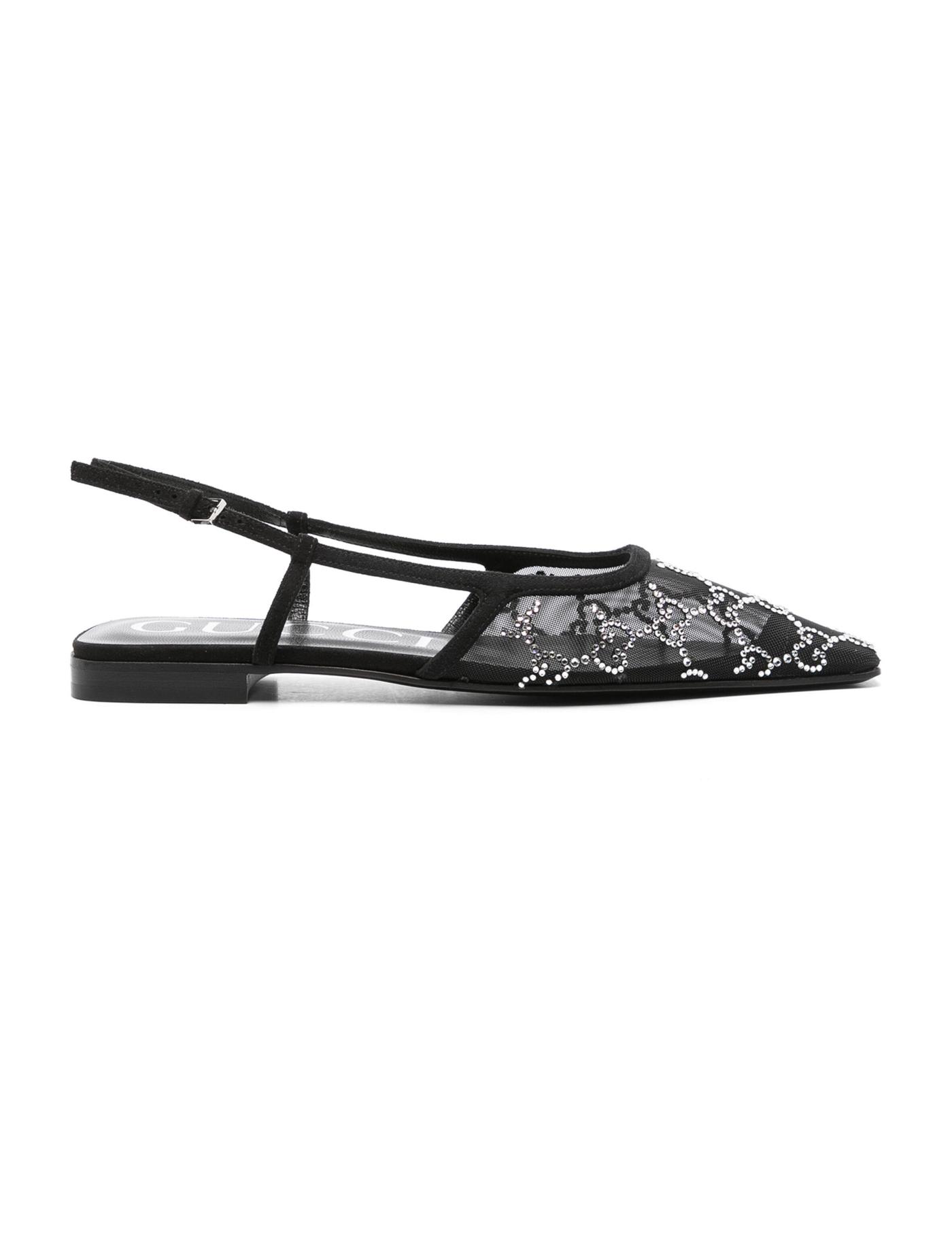 An iconic Gucci hallmark, the GG motif takes focus in these slingback ballerina shoes. Instead of the traditional canvas or embroidered design, the logo is patterned in shimmering crystals throughout the mesh construction.