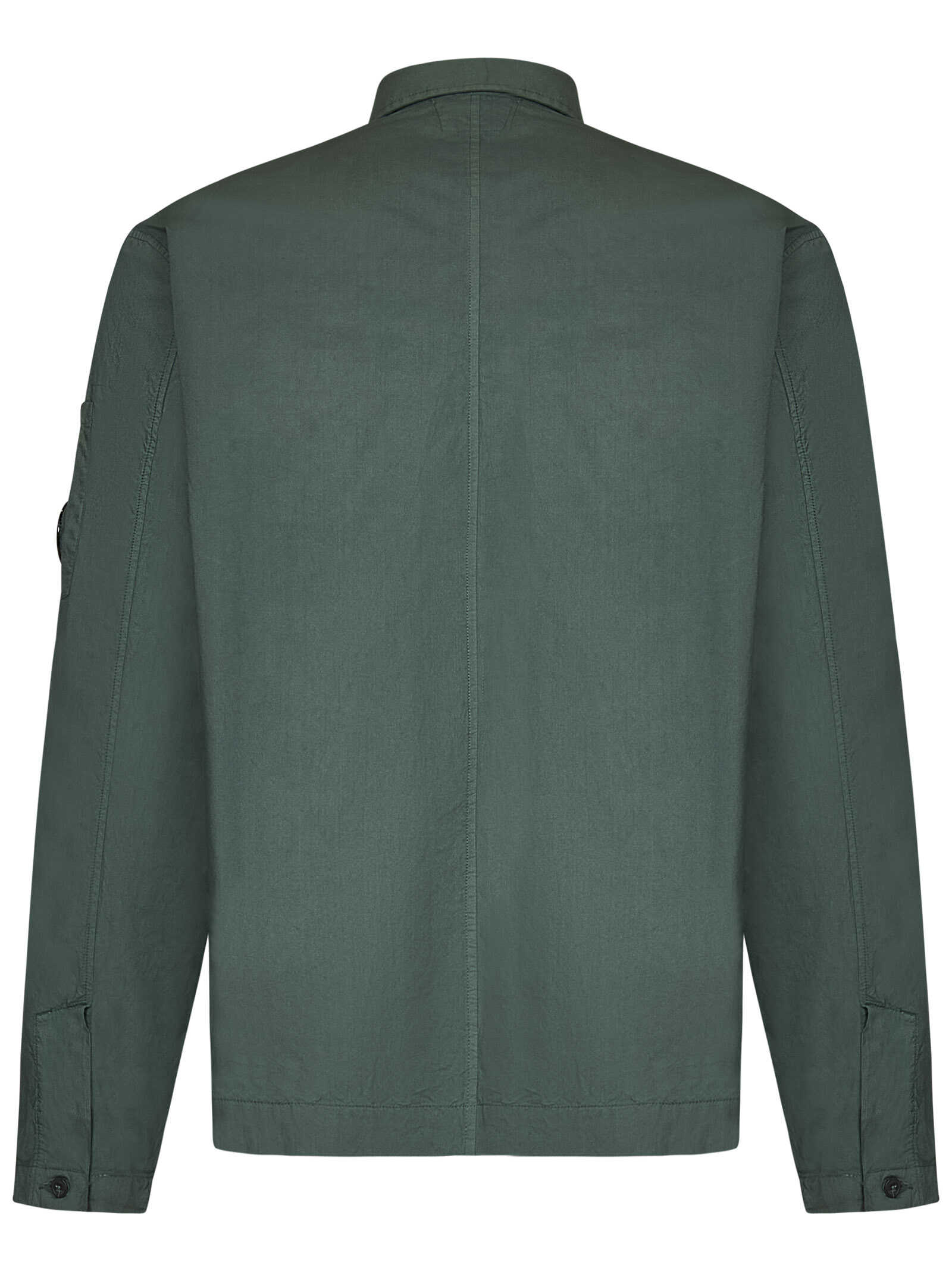 Green cotton poplin overshirt with Lens detail at sleeve.