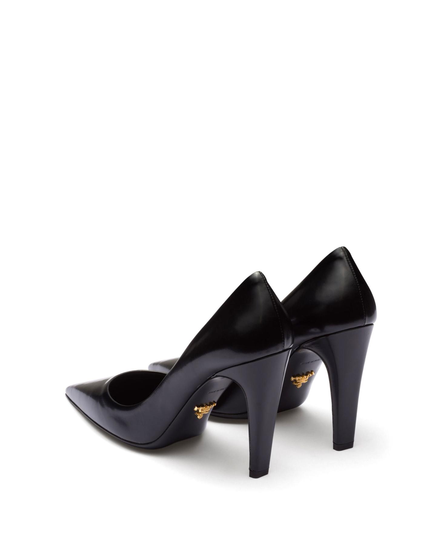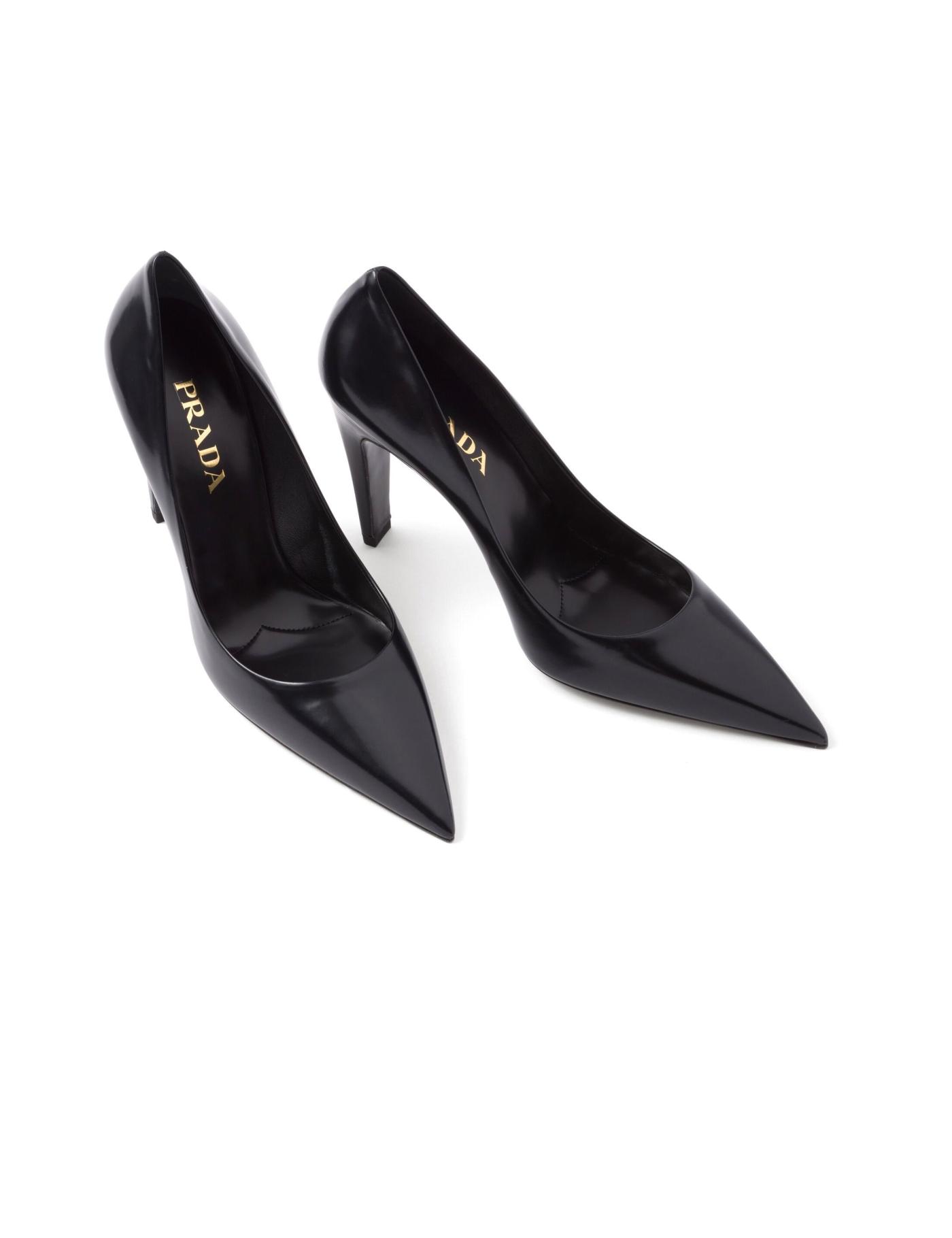 Prada injects its sleek minimalism into these classic pumps. Crafted from brushed black leather, its pointed toe sits atop a towering 100mm heel.
