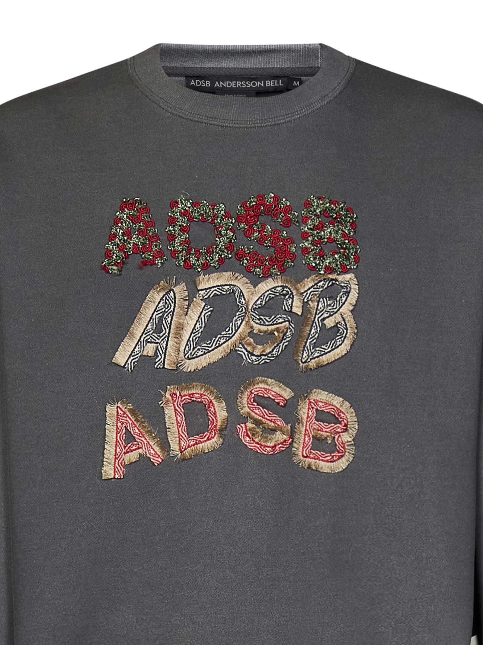 Charcoal gray cotton blend crewneck sweatshirt with multi-logo embroidery on the front.