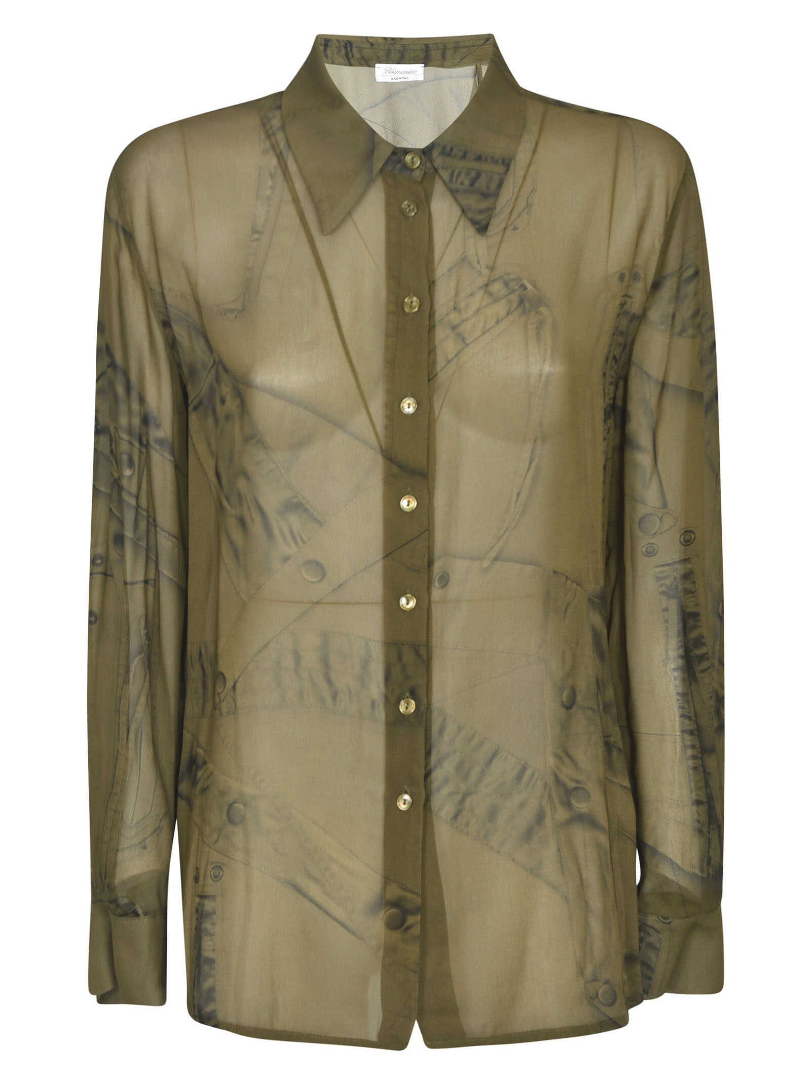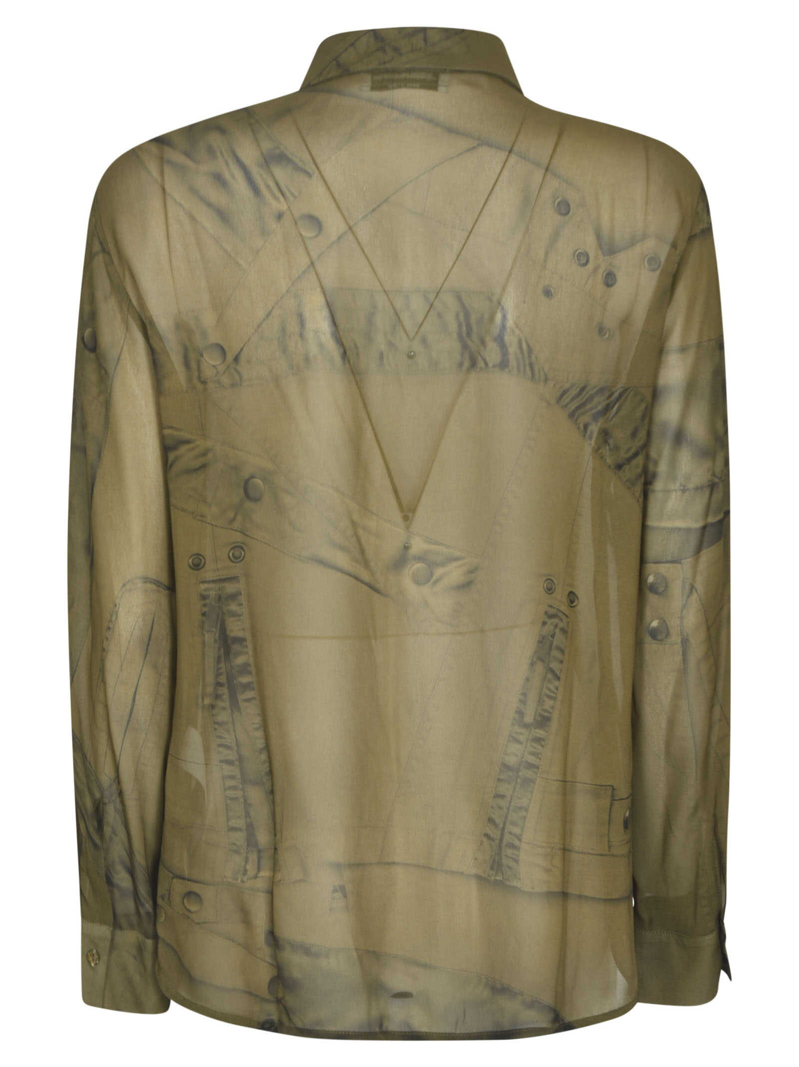 khaki georgette crepe abstract pattern print semi-sheer construction pointed flat collar front button fastening drop shoulder long sleeves buttoned cuffs curved hem