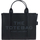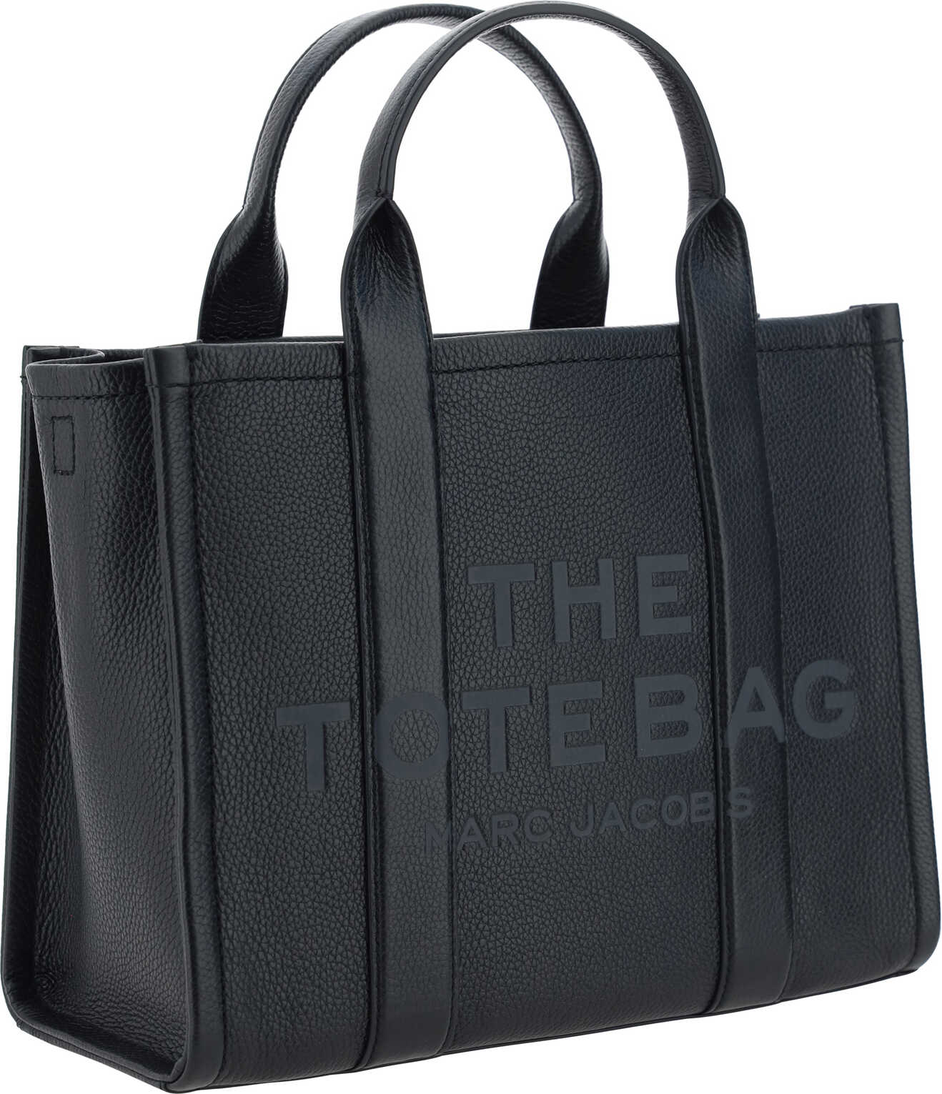 Marc Jacobs' The Medium leather Hand Bag Tote features a grained leather design. It has two stiff tubular handles at the top and a zipper closure. Inside, there is a single pocket for added convenience. The bag also features an adjustable and removable flat shoulder strap. The brand's iconic monogram is embossed on both the front and back, adding a distinctive and recognizable touch.