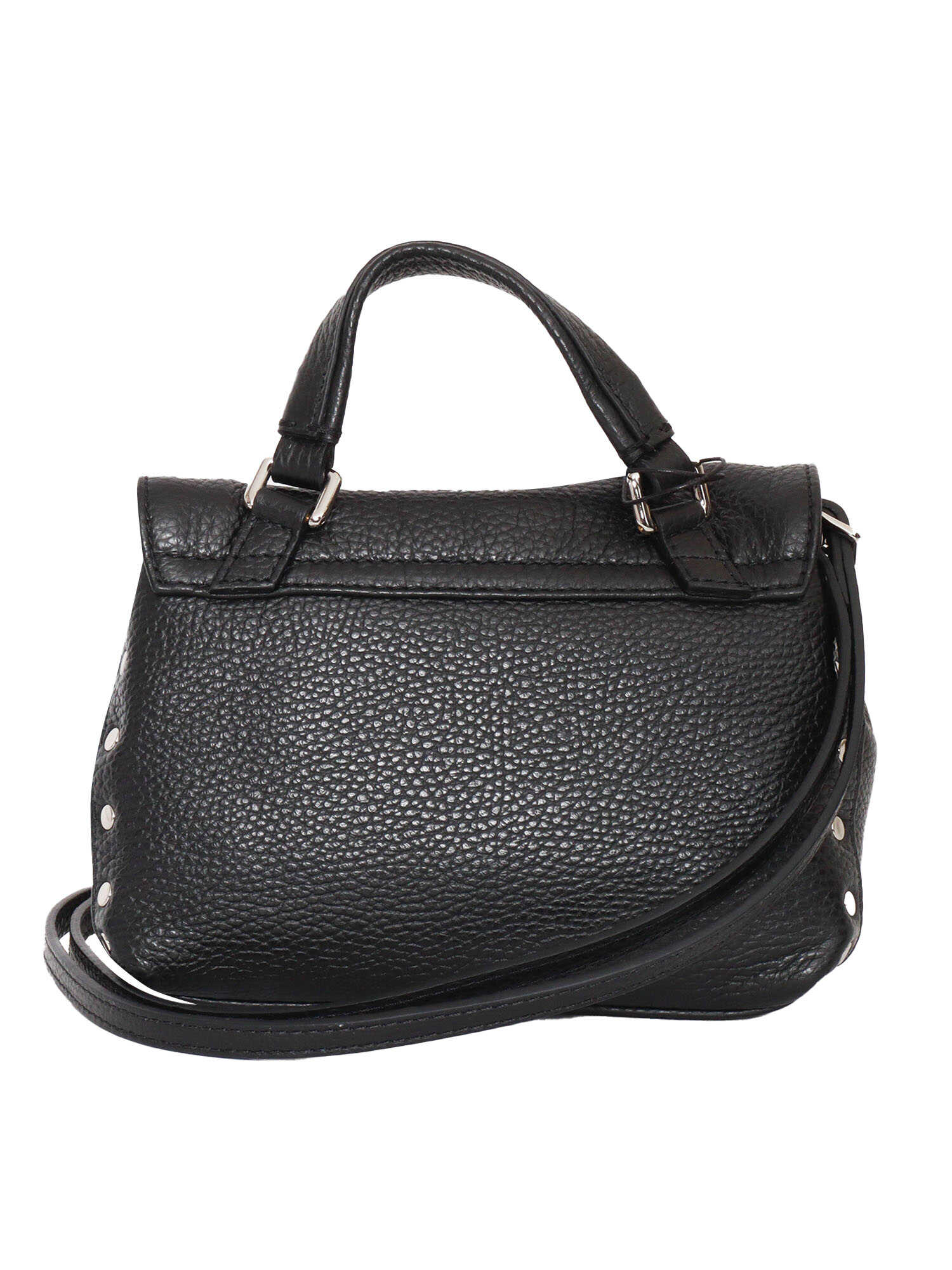 Postina Daily baby black in calfskin with handle, shoulder strap, flap closure with metal clip.