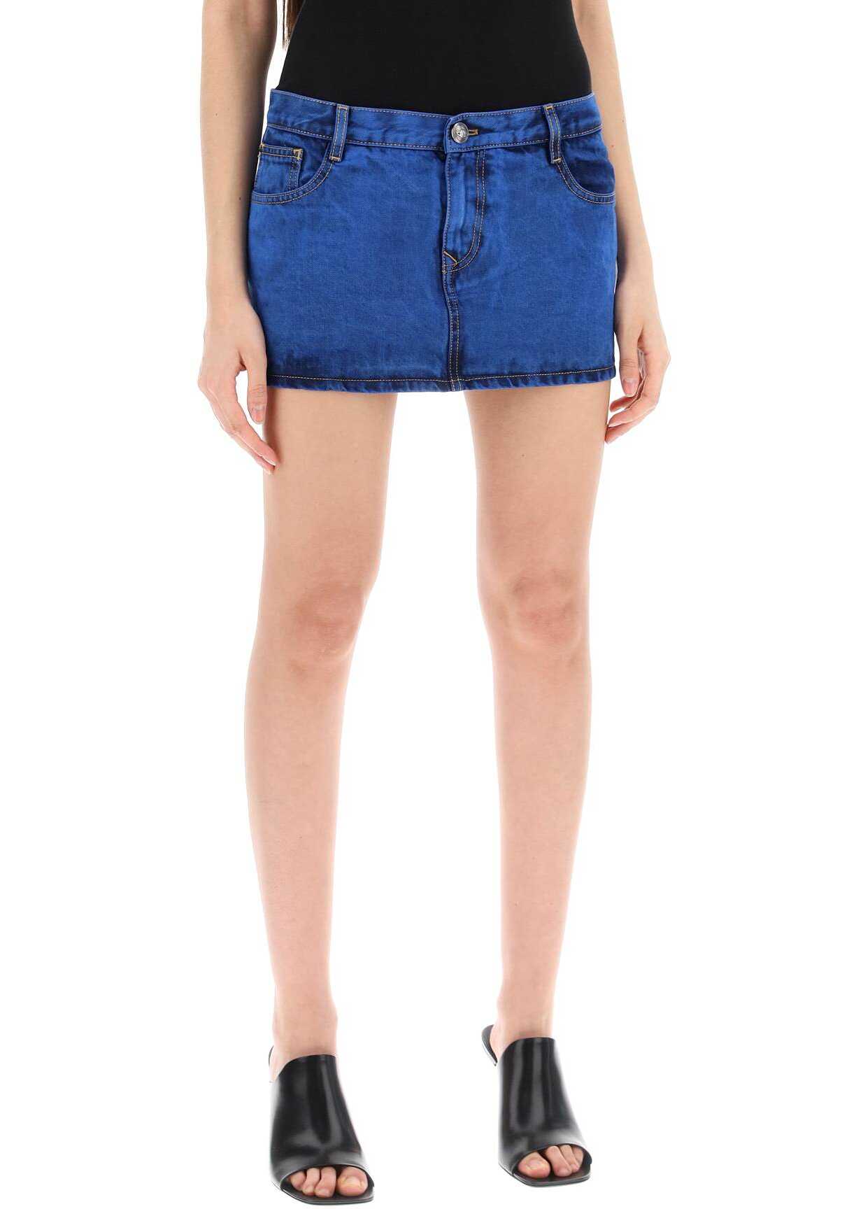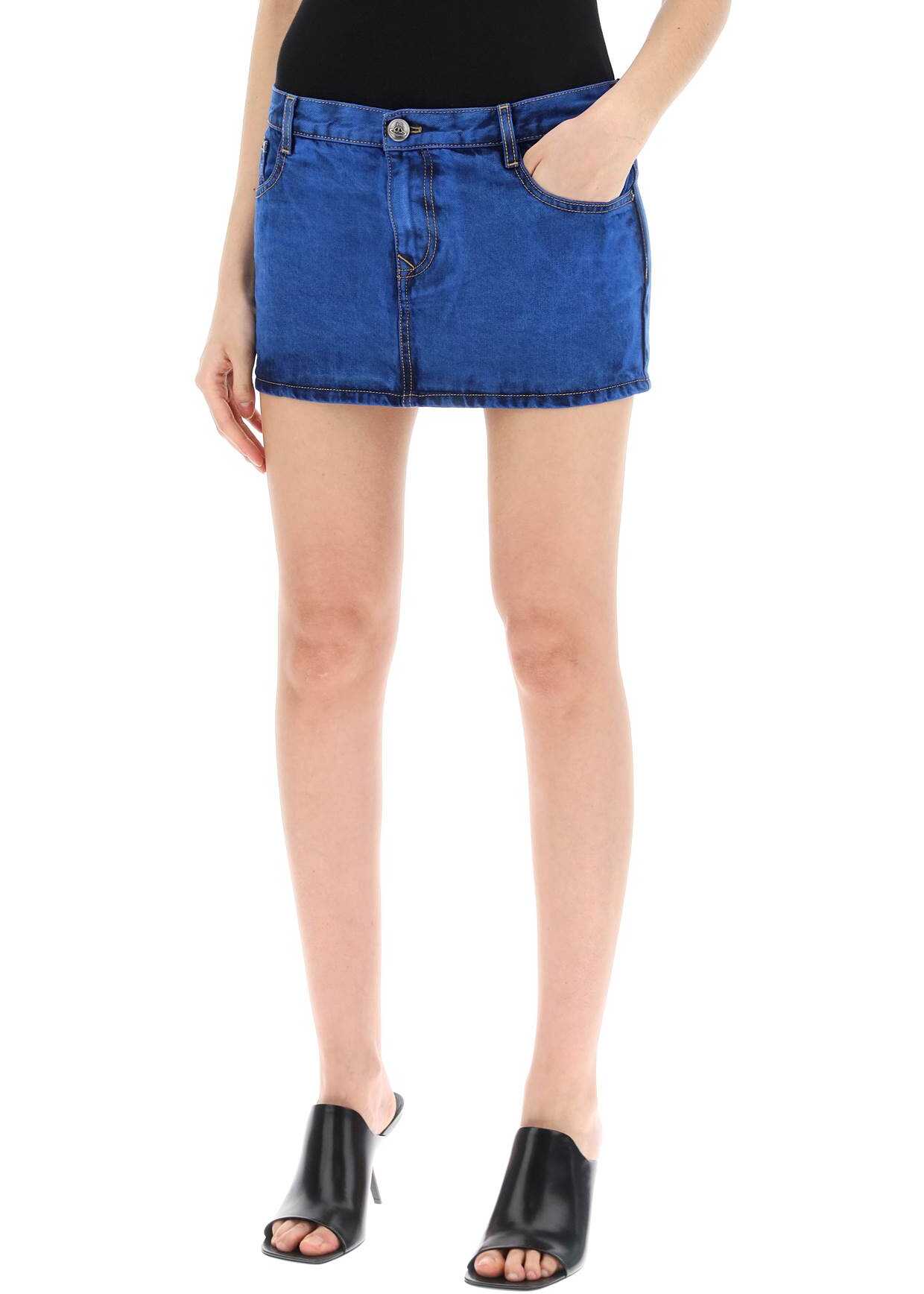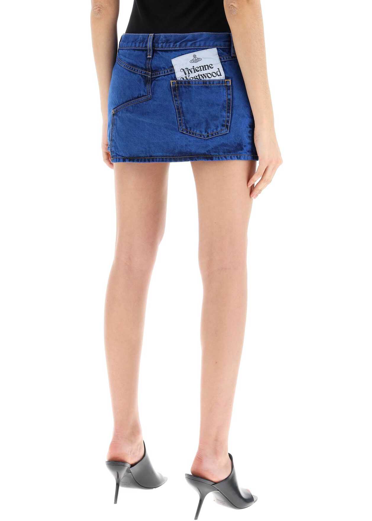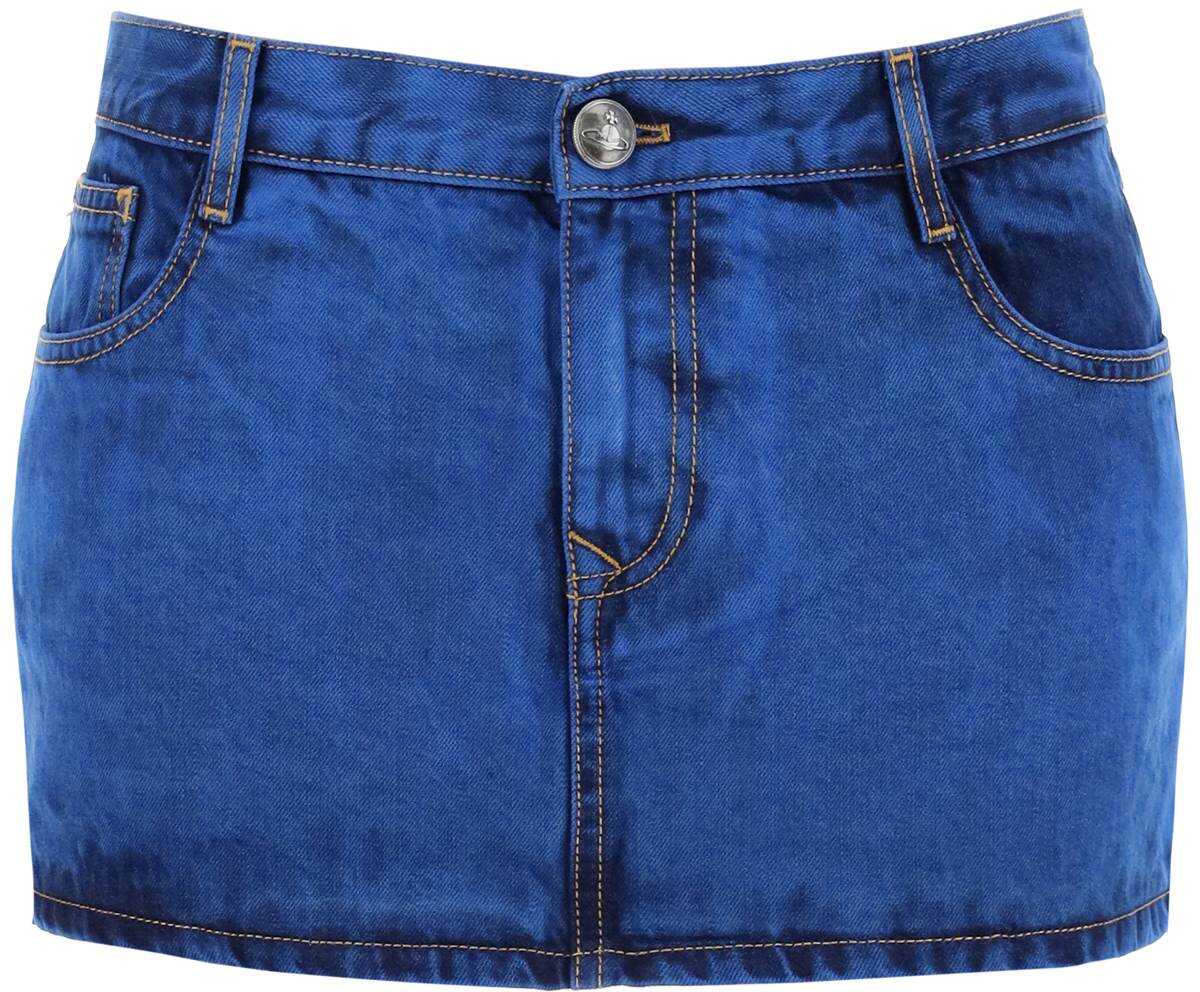 The Foam Mini Skirt by Vivienne Westwood is made of overdyed denim in a stone wash. The design features five pockets, a zip and embossed Orb button closure, belt loops, and a center slit with a fabric label on the back. It has a straight and regular fit with a low waist. The model is 177 cm tall and wears a size 26.