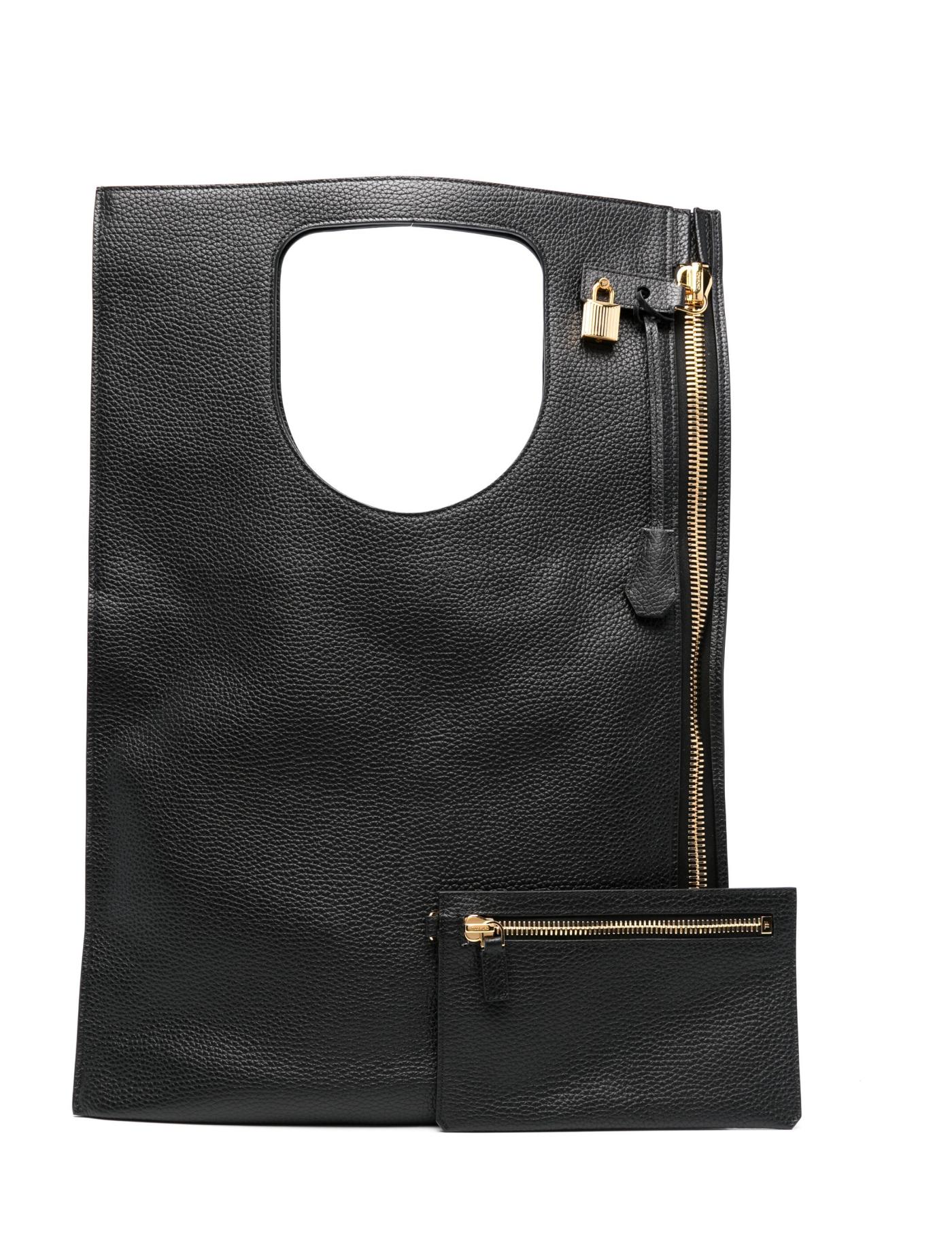 True to TOM FORD's understated and timeless style, this Alix bag is crafted in black grained leather. The flat silhouette is detailed with a gold-tone zip at the side at the side that secures with a key and padlock.