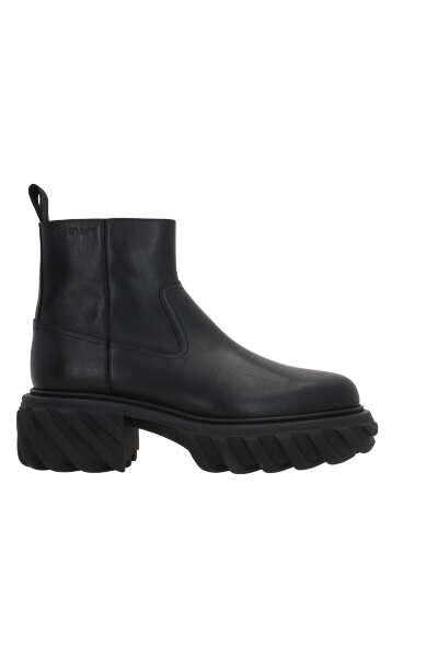 Off White's ankle boots crafted in black smooth leather with the iconic logo embossed on side. Featuring side zip closure, a round-toe silhouette, leather lining and rubber sole with Diagonals details.