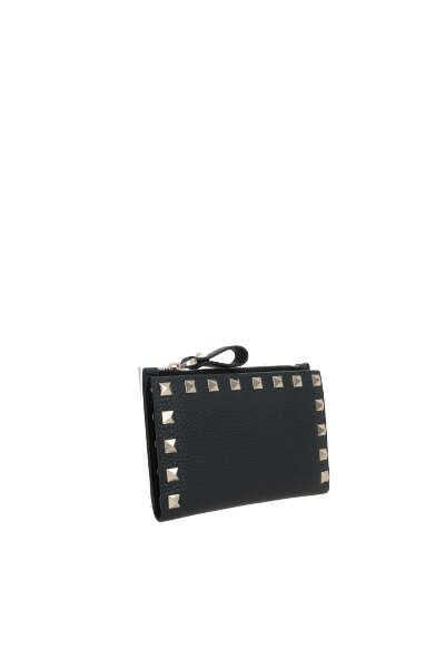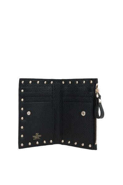Valentino Garavani's credit card holder crafted in black grained leather adorned with platinum-tone metal studs. It features internal snap-button closure and external zip coin pocket. Leather / fabric-lined interior with two slip pockets and eight card slots. The design is completed by the unmistakable logo embossed at back.