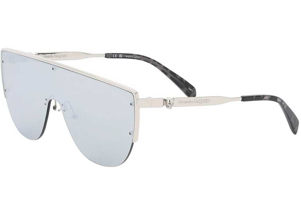 Alexander McQueen sunglasses with a silver metal frame and mirrored lenses. Decorated with a Skull detail on the thin engraved temples. 100% protection against UVA/UVB rays. Protective case included.