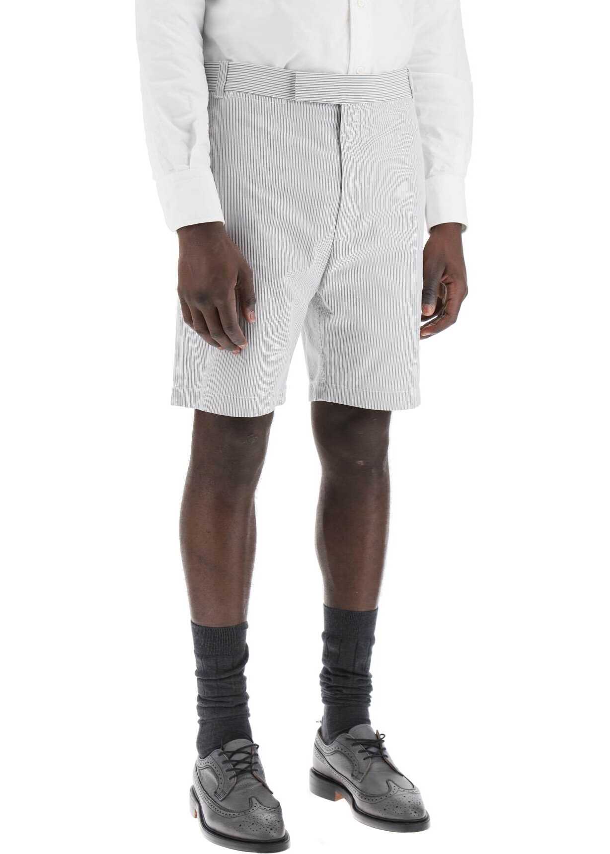 These Thom Browne striped Bermuda shorts are made of pure cotton dobby and finished with the iconic tricolor grosgrain tab on the back. The design features a straight, regular fit with a zip and concealed hook closure, belt loops, side seam pockets, and buttoned welt pockets on the back. The model is 187 cm tall and wears size 2.