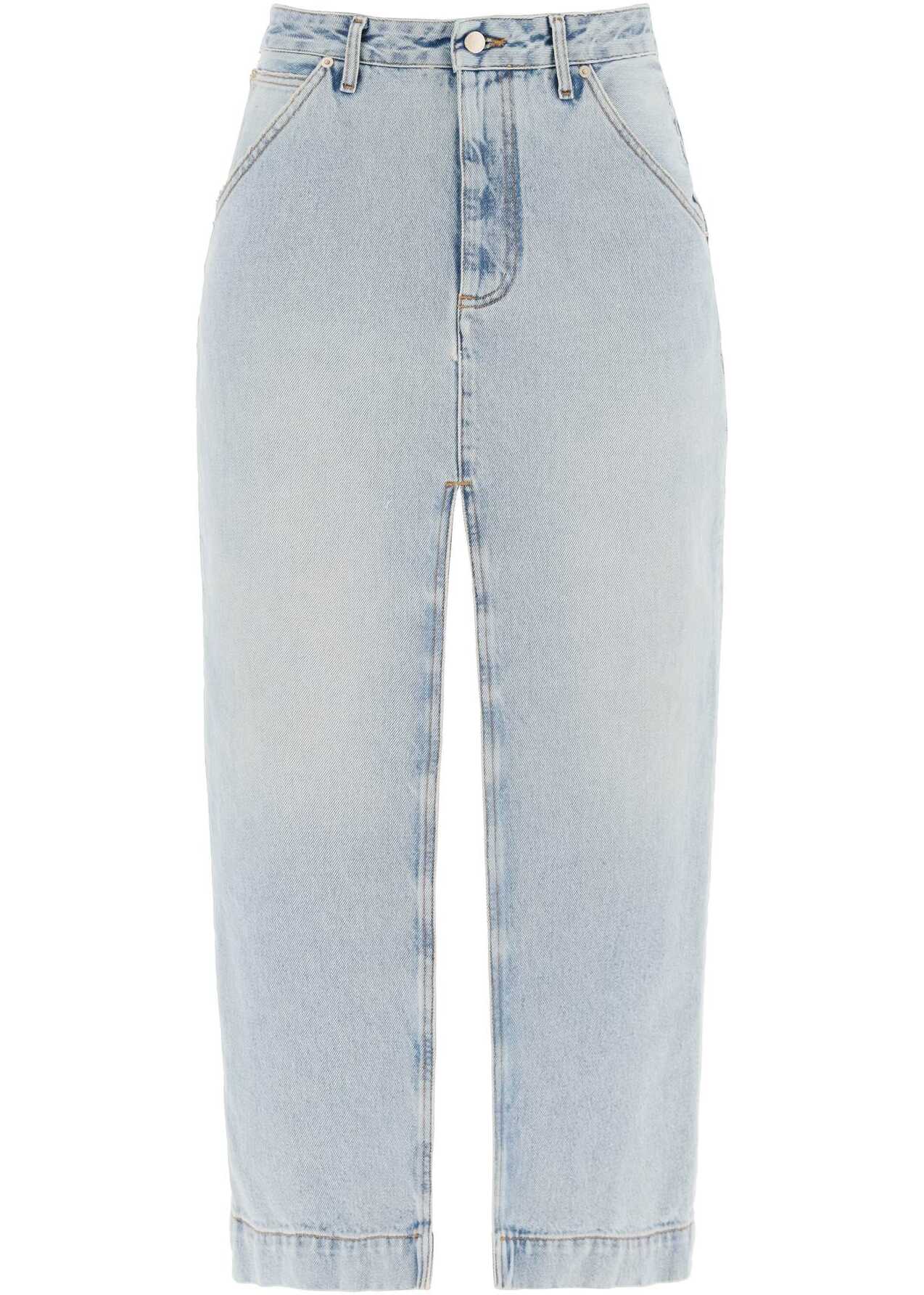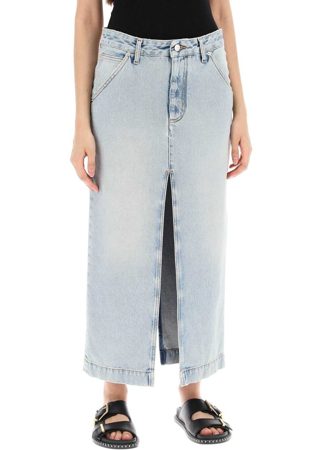 The Erika midi skirt by DARKPARK is made of pure cotton denim with a light wash and distressed finish. It features a five-pocket design with belt loops, a zip fly and button closure adorned with a branded leather patch and a central slit on the front and back. The slim silhouette is achieved through its pencil shape. The model is 177 cm tall and wears size 26.