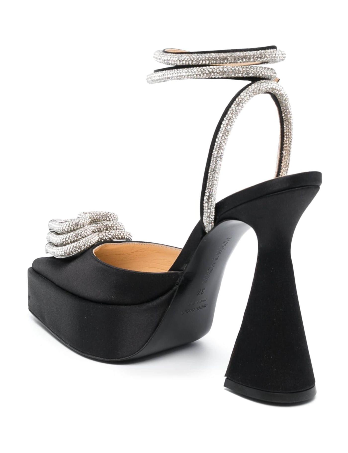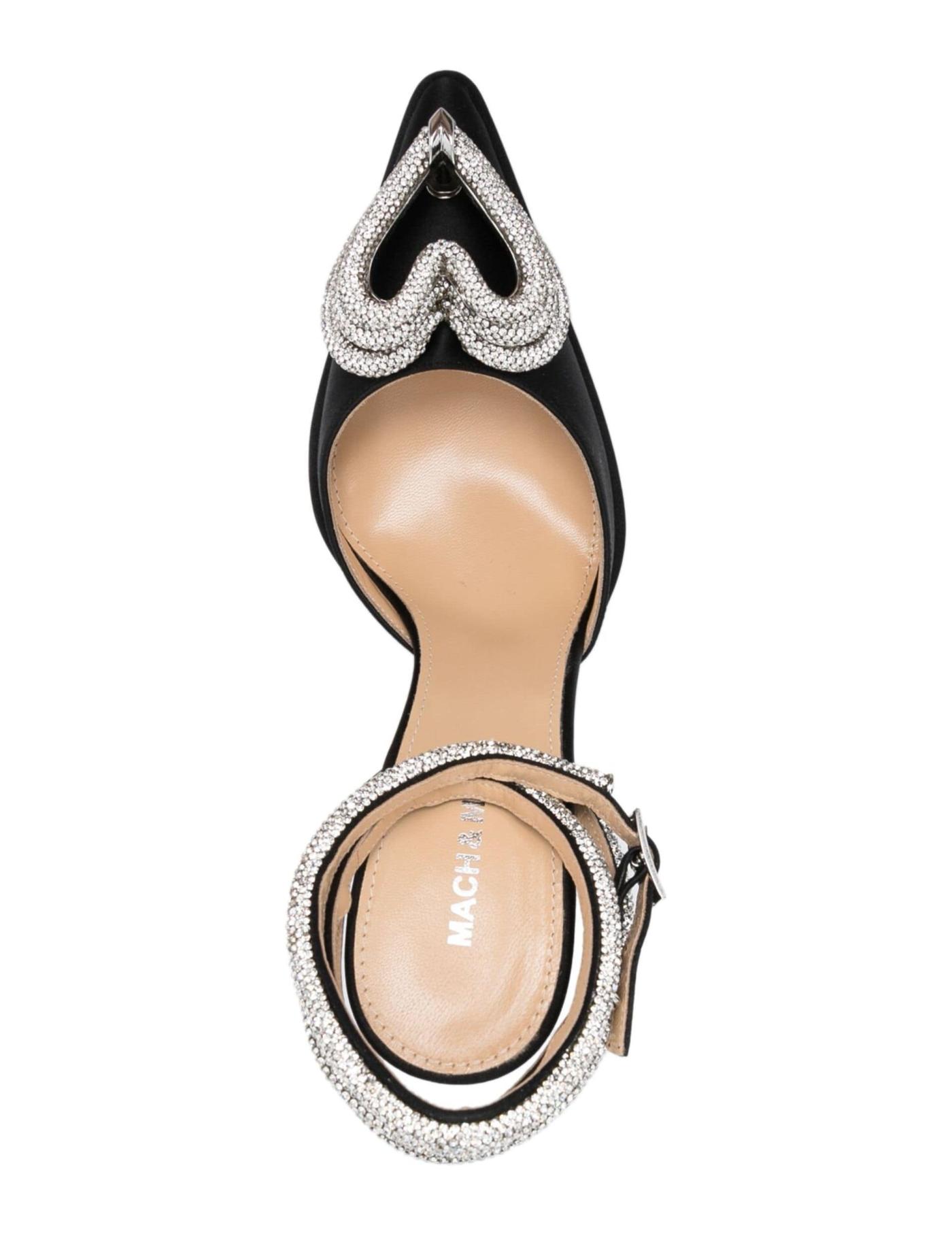 MACH & MACH realises an indulgent aesthetic through bold silhouettes and shimmering embellishments. A case in point, these black Triple Heart pumps are made from satiny fabric, sitting atop a towering sculpted heel and thick platform sole. Crystals encrust the ankle strap and the stacked heart motifs at the toebox, infusing sparkle and romance.