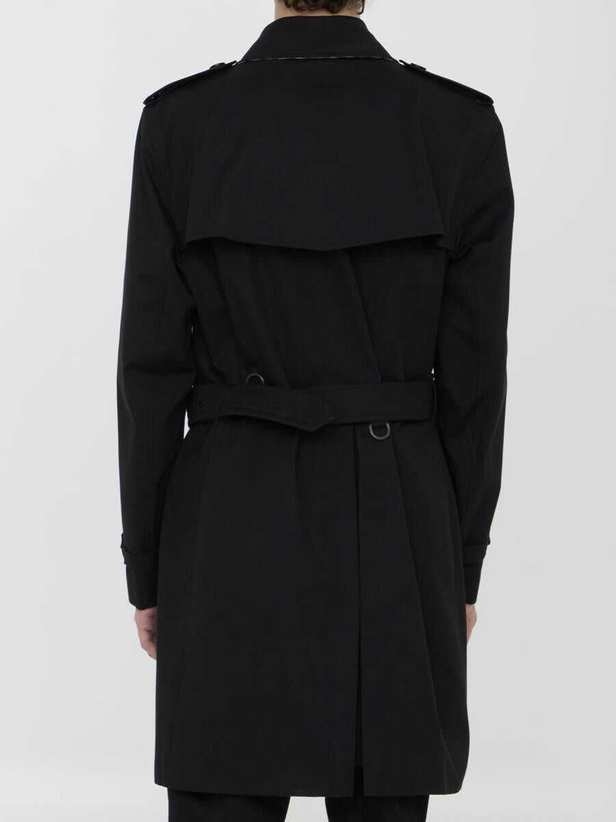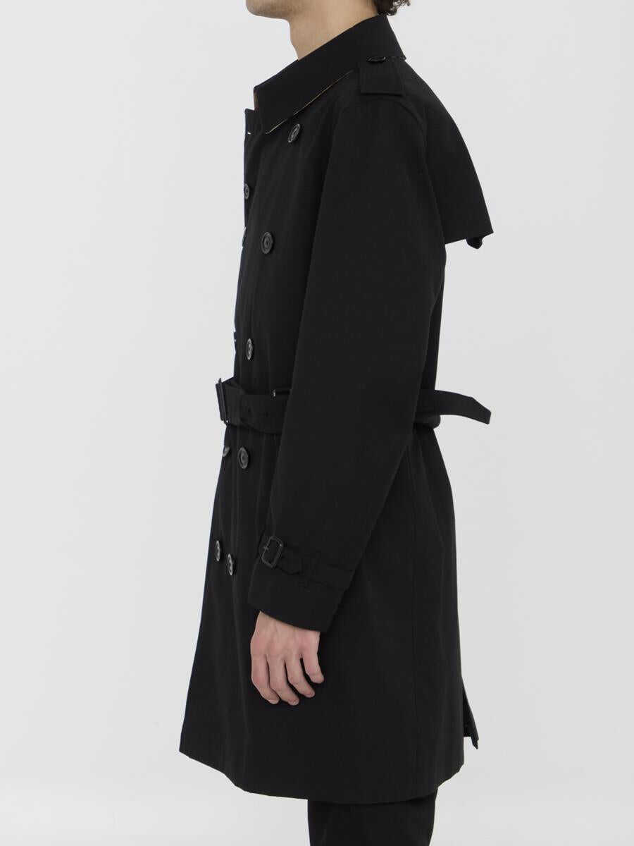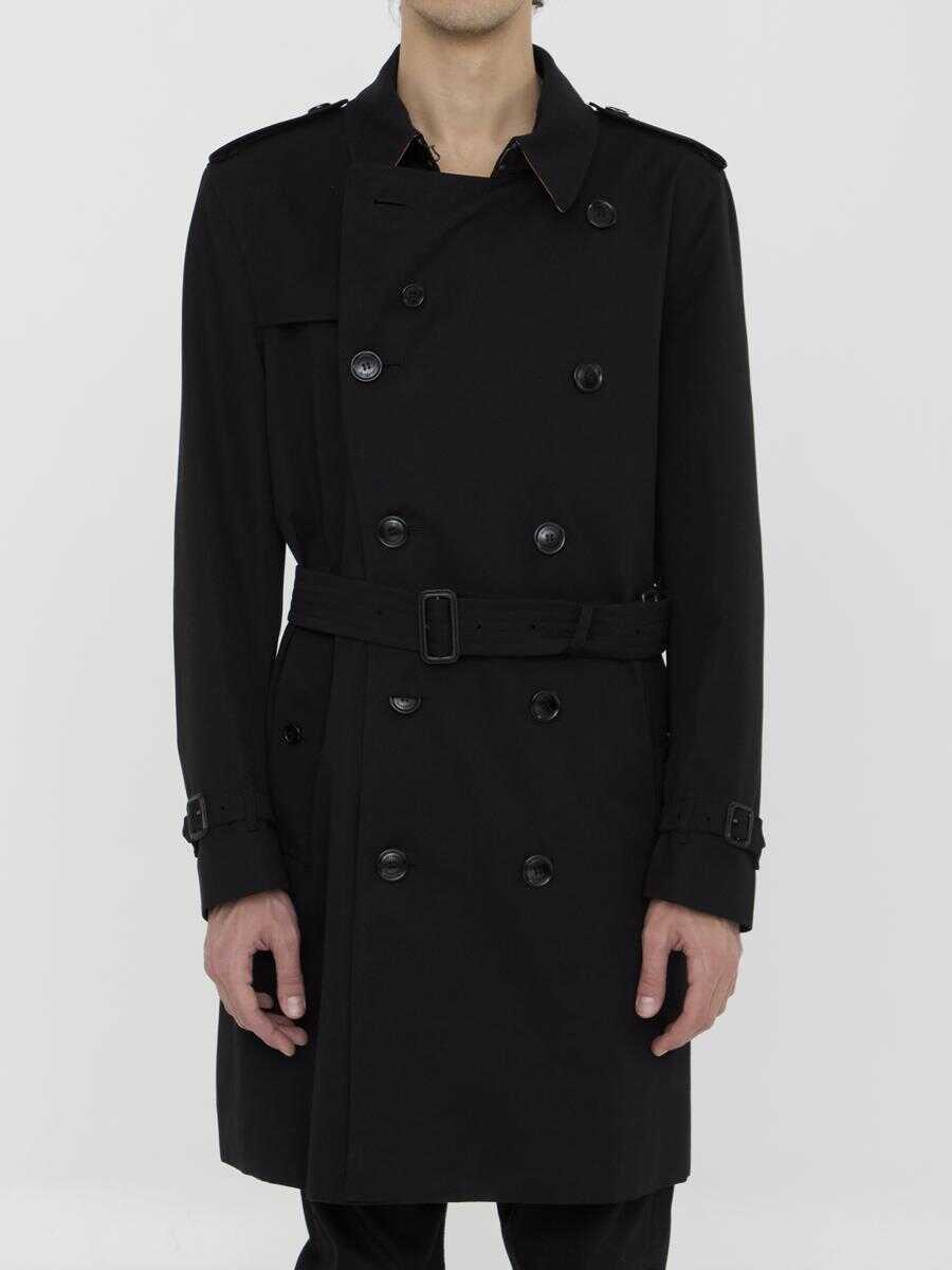 Heritage Kensington medium trench coat in black water-repellent cotton gabardine. It features epaulettes, hook closure on collar, double-breasted button closure, detachable belt at waist, two side buttoned welt pockets, belted cuffs, buttoned back vent and Burberry Check lining. Regular fit.