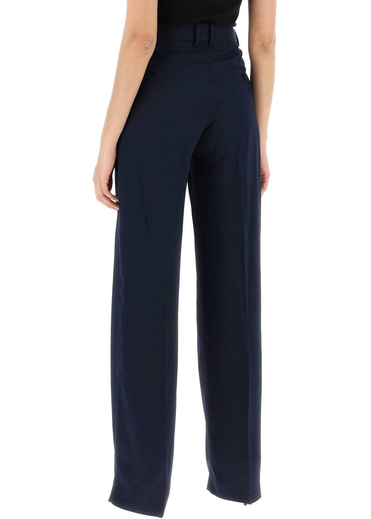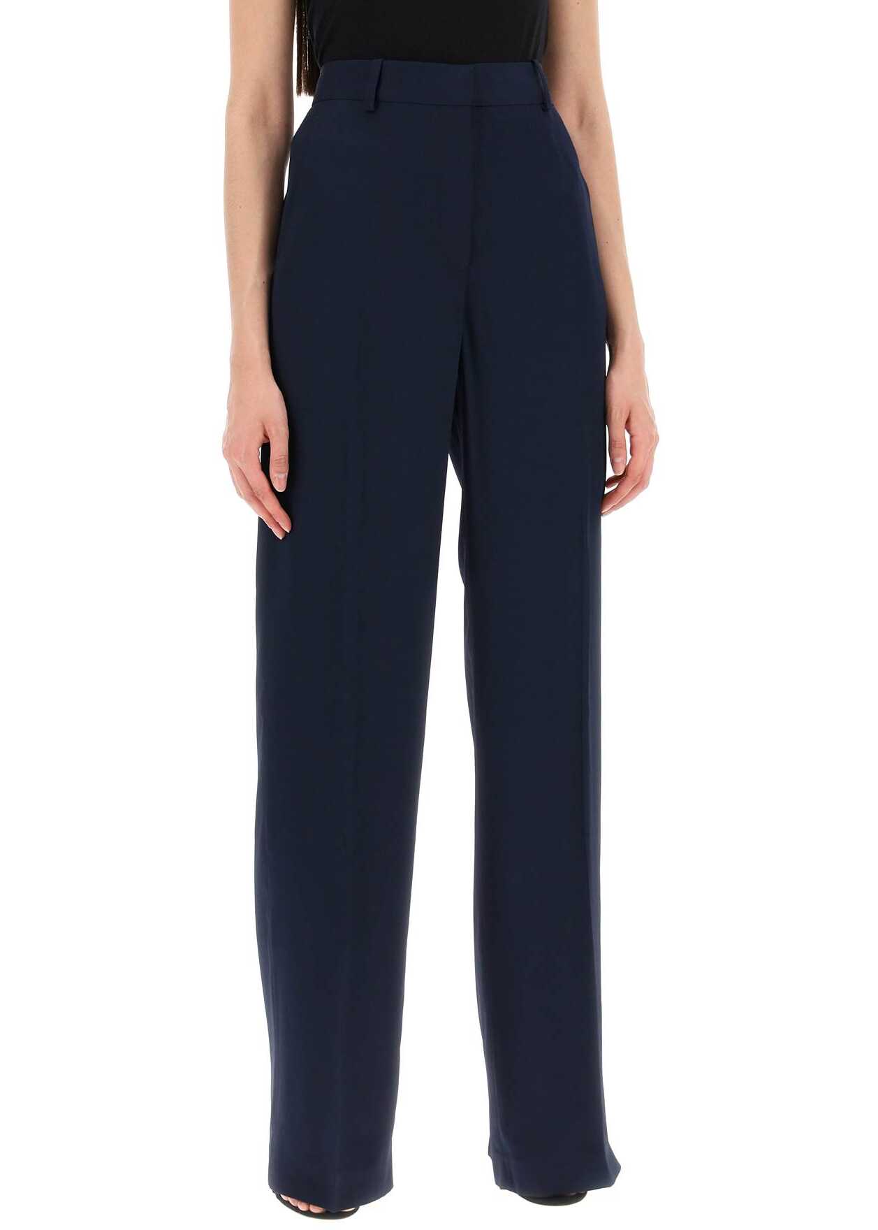 Stella McCartney's palazzo pants, with a flattering pleated design, are made from sustainable fluid viscose crepe. They feature a hidden zip closure, button and hooks, as well as French side pockets, belt loops, and a back welt pocket with a button. The model is 177 cm tall and wears an IT size 40.