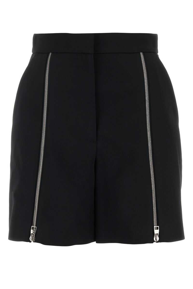 Black wool zipped shorts from Alexander McQueen featuring high wiast, concealed zip closure with hook, side pockets, mid length, zipped details at front and silver tone metal finishes.