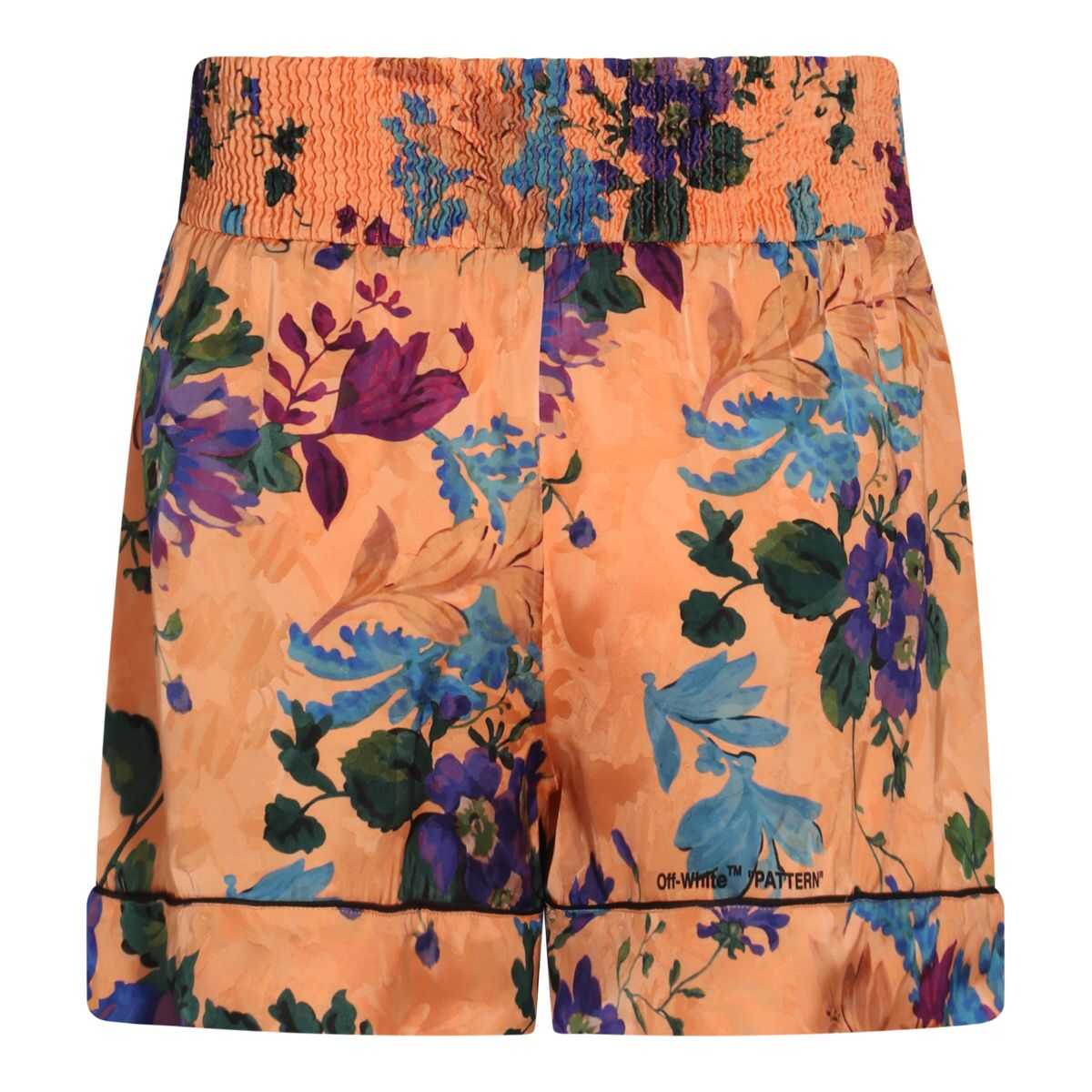 Peach orange viscose shorts from Off-White featuring elasticated high waistband, all over floreal print, side pockets and logo label at front.