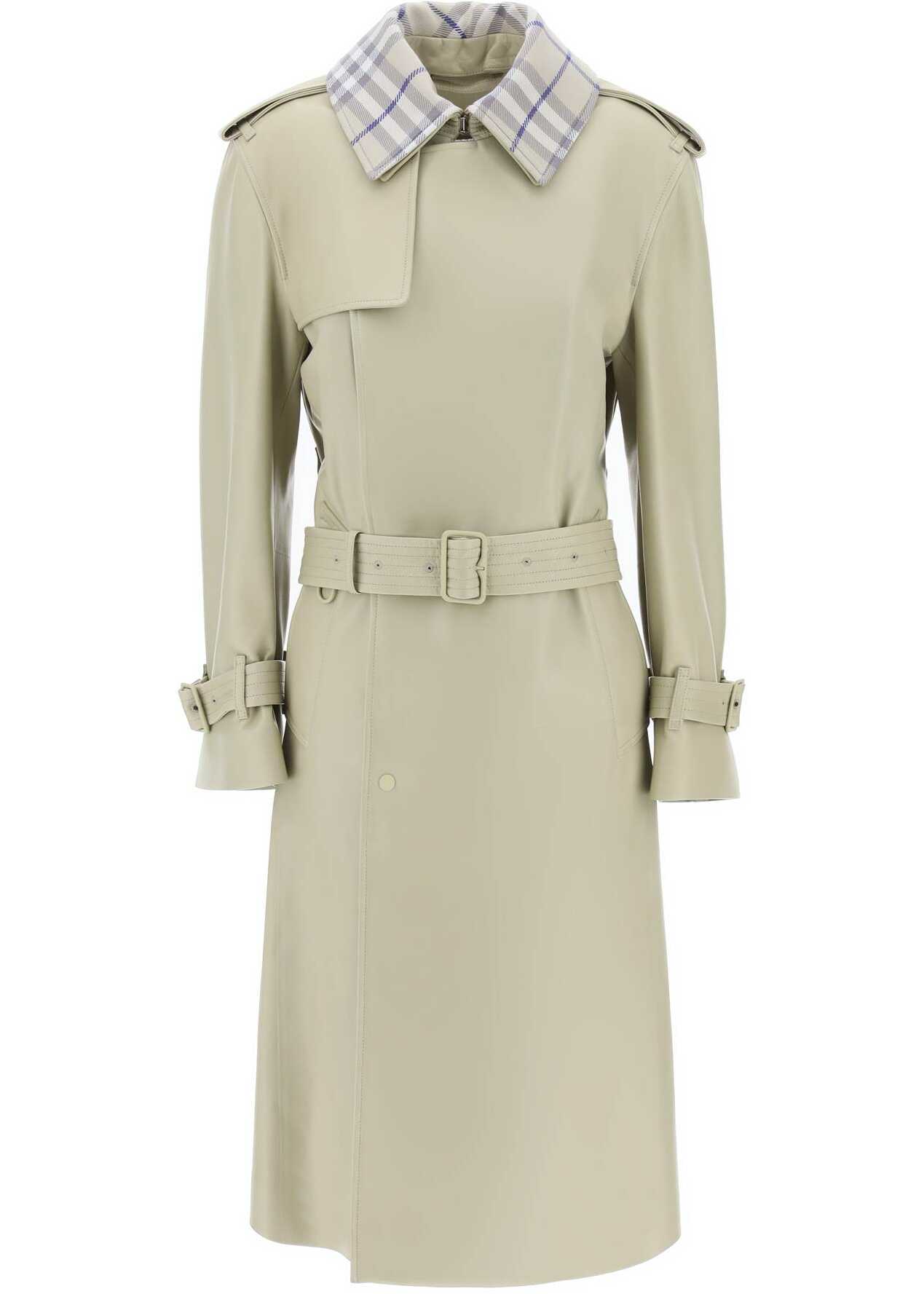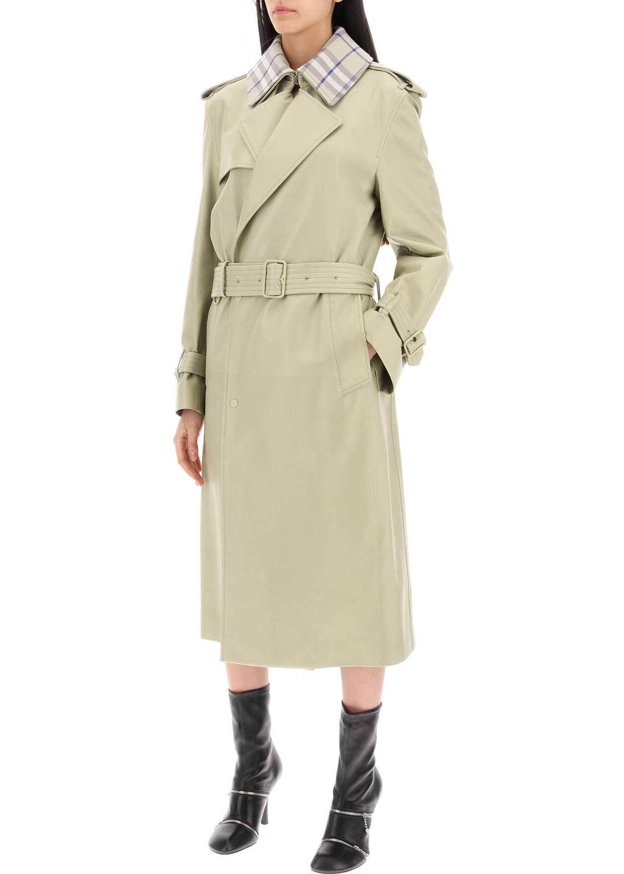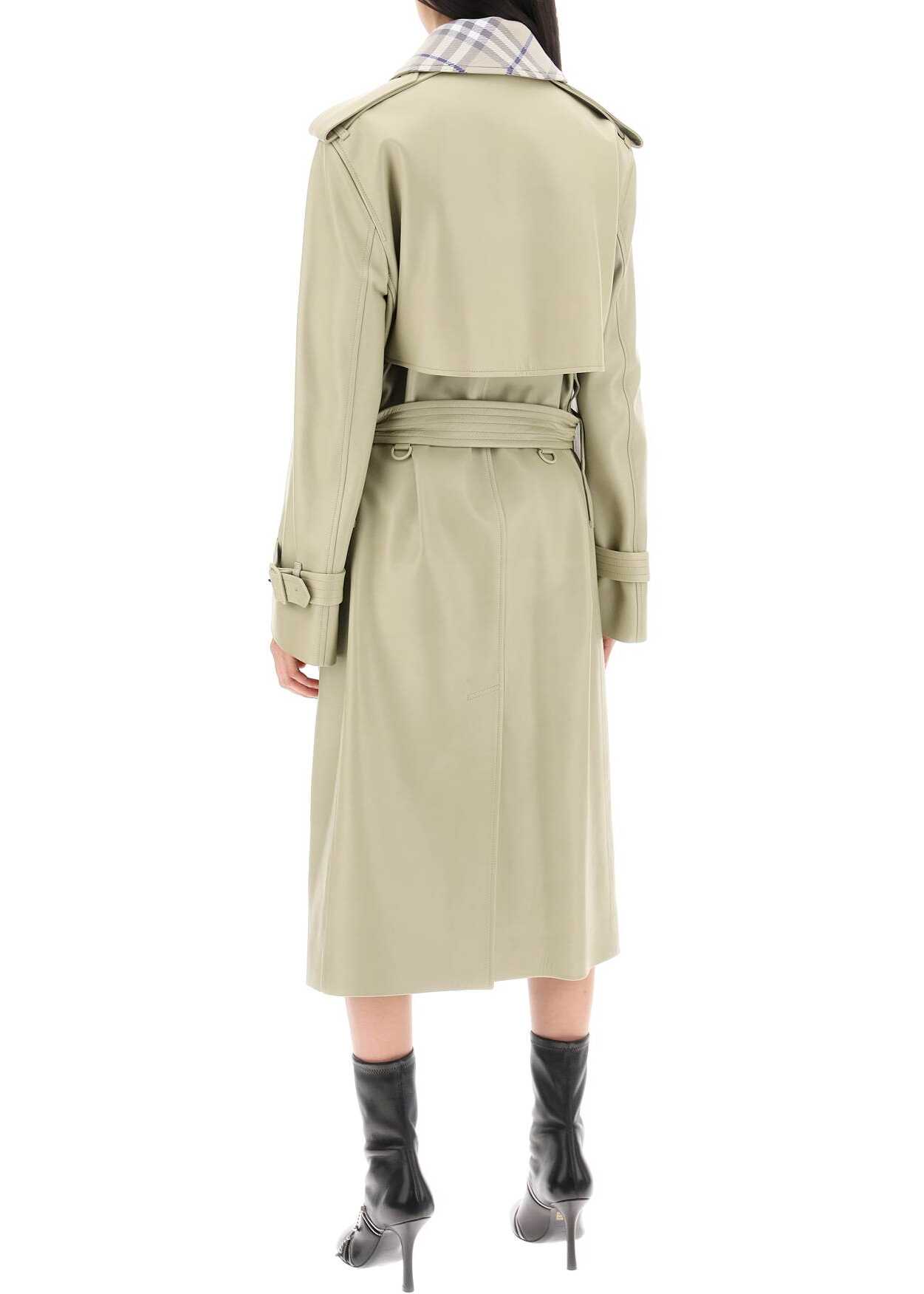 This Burberry double-breasted trench coat is made of soft plongé leather with a double collar, the upper one being removable and decorated with the iconic Burberry Check pattern. It features a throat latch, epaulettes on the shoulders, a front flap, a back storm shield, welt pockets on the front, and adjustable cuffs with straps. Finished with a back vent and complete with a belt featuring a B-shaped buckle that can be worn at three different heights to change the silhouette
