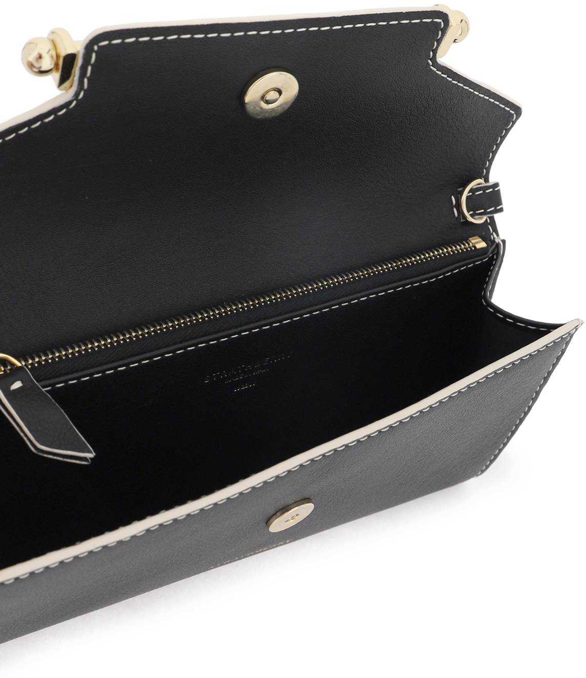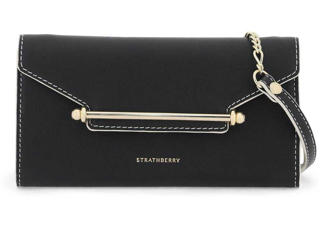 Multress mini crossbody bag by Strathberry made of leather with contrasting trim and iconic metal bar applied to the flap. Magnetic closure, interior with one zipper pocket and eight card slots, and detachable chain shoulder strap with leather insert. Palladium-finished metalware.
