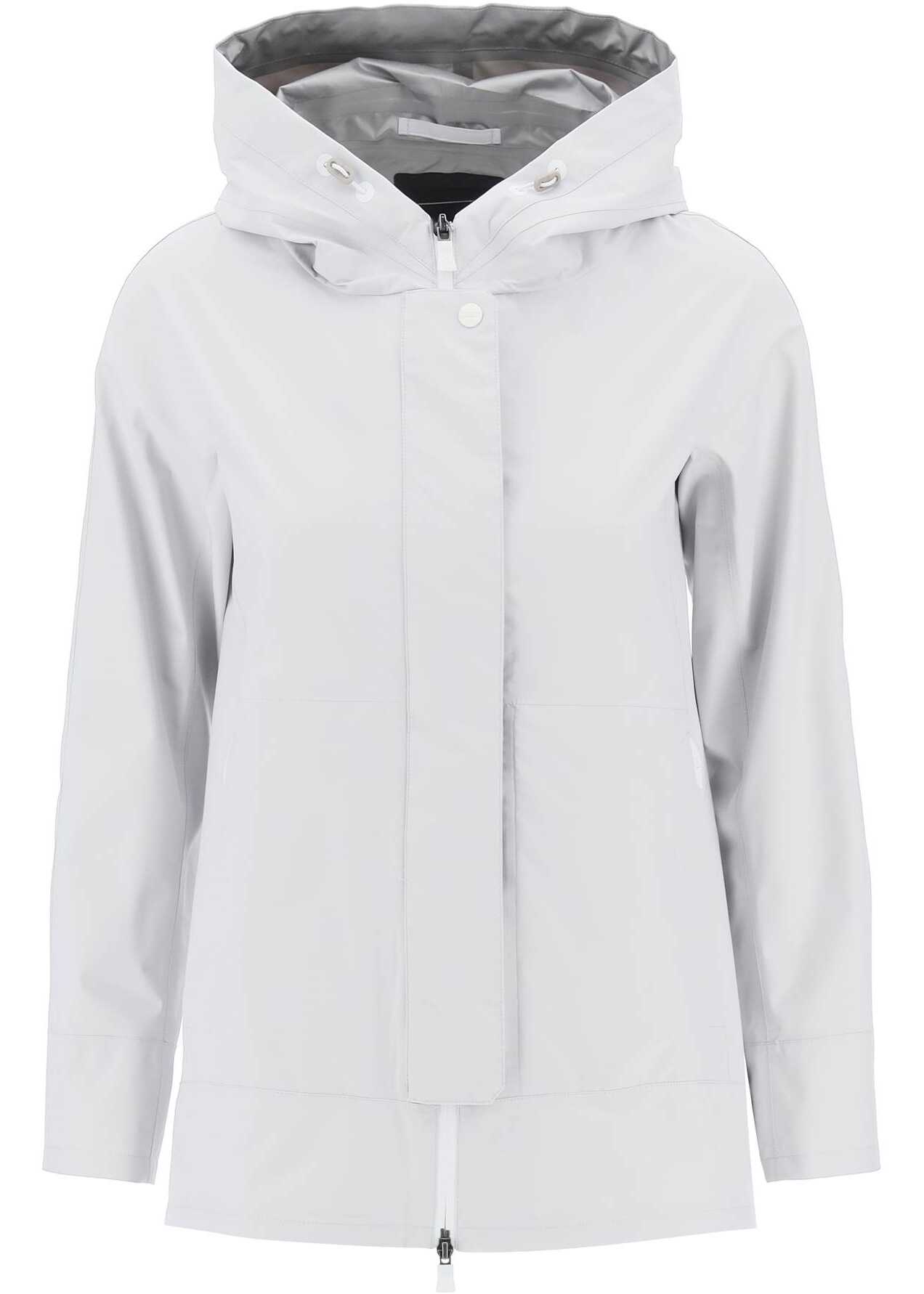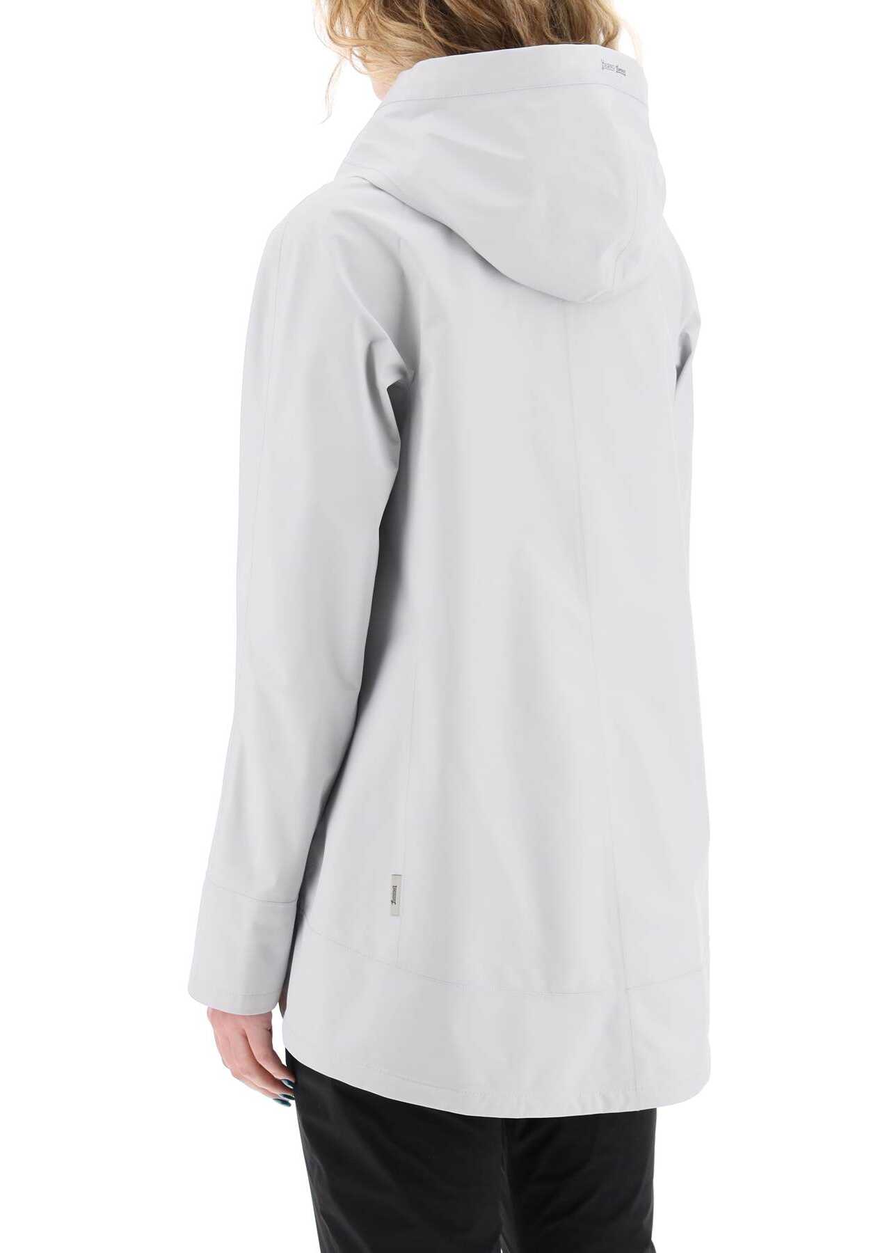 This lightweight jacket from Herno's Laminar line is made of Gore-Tex, a technical fabric that is waterproof, windproof, and breathable. It features an A-line midi cut with an asymmetric hem that is slightly longer in the back, a hidden double-slider zip closure, snap buttons, adjustable hood, and side pockets with hidden zips. The garment is finished with heat-sealed seams and an inner pocket. The model is 177 cm tall and wears size IT 38.